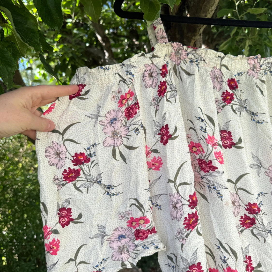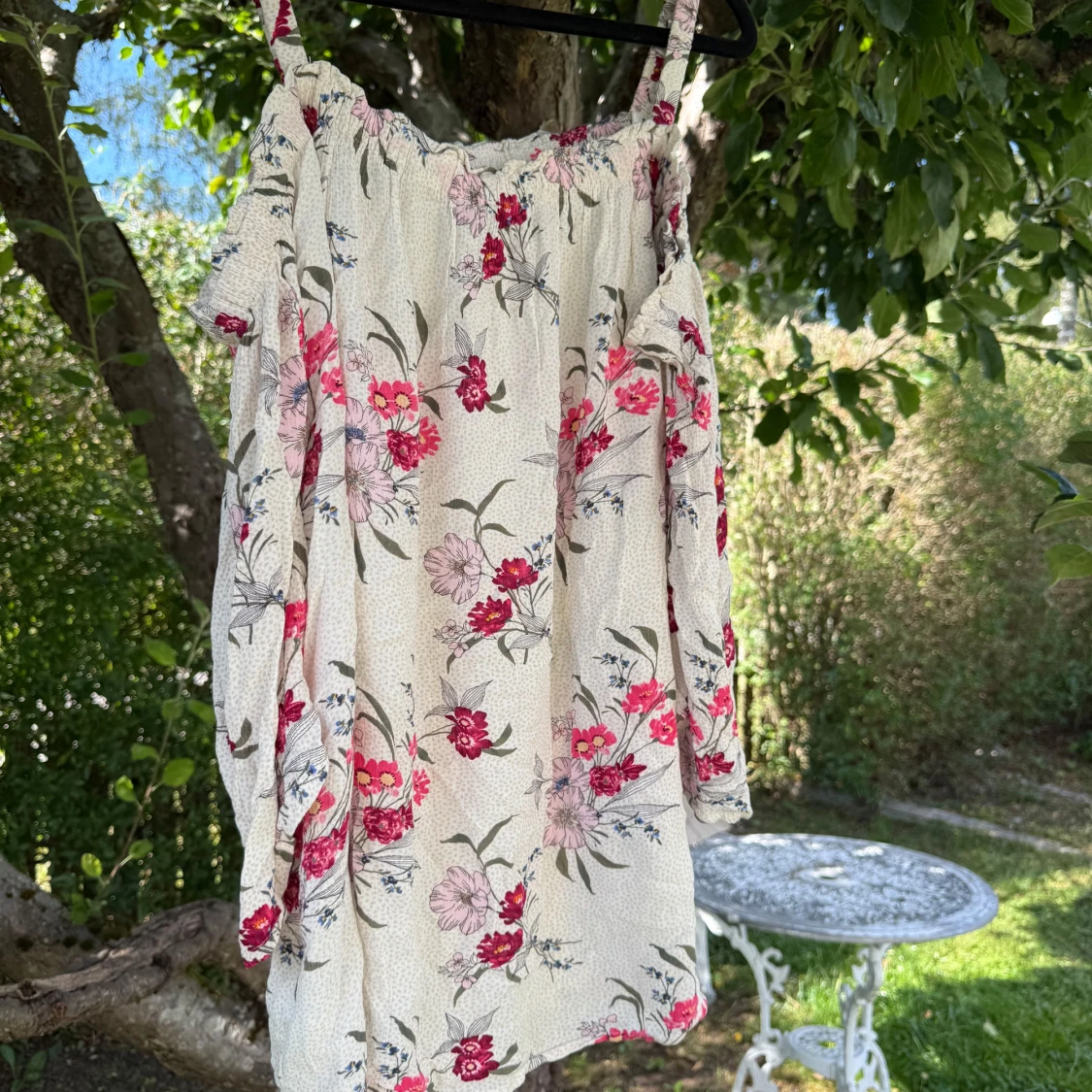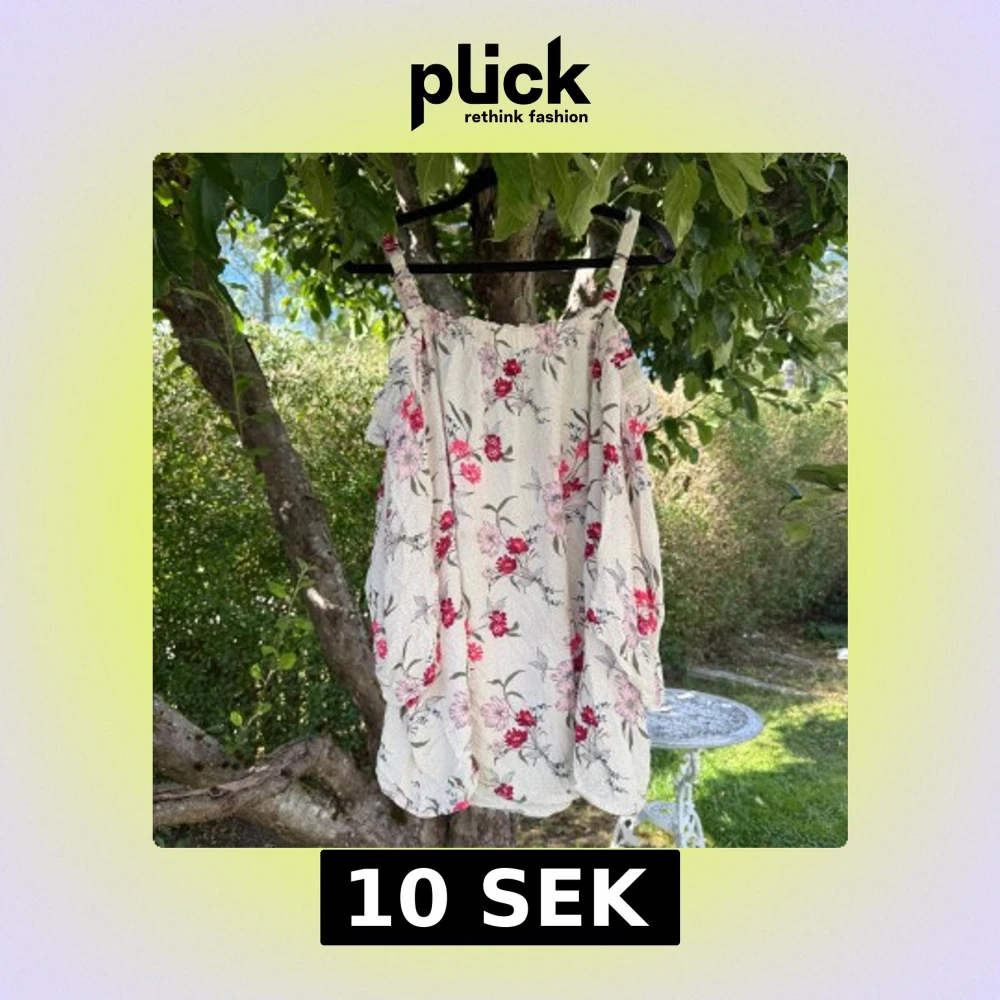 Supersöt kort topp med tunna axelband och blommigt mönster i rosa, rött och lila på en ljus bakgrund. Klänningen har en luftig passform och är perfekt för varma dagar. Materialet känns lätt och mjukt mot huden, och den har en avslappnad vibe. Storlek XL. Mycket fint skick, jag hittar inga synliga anmärkningar eller defekter.