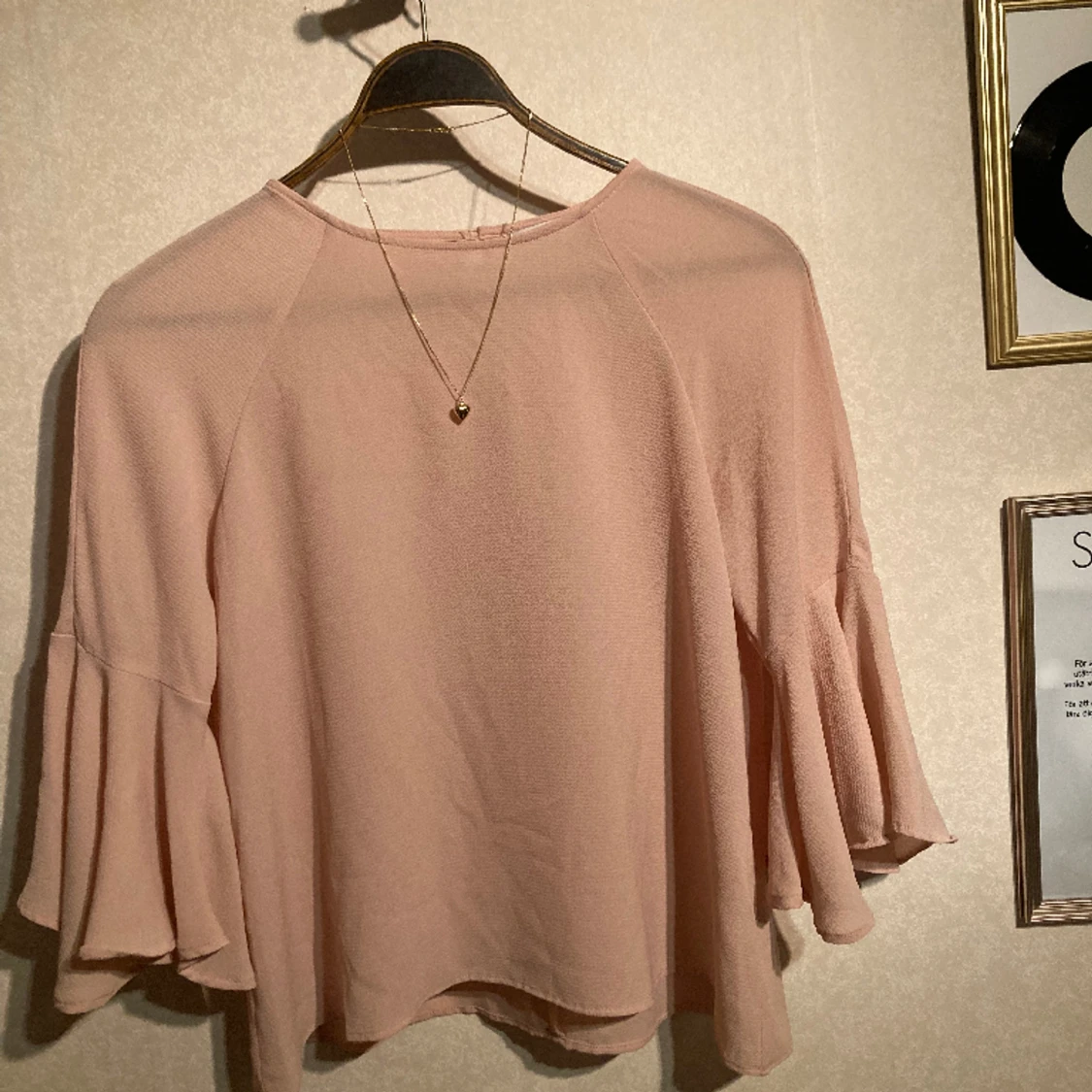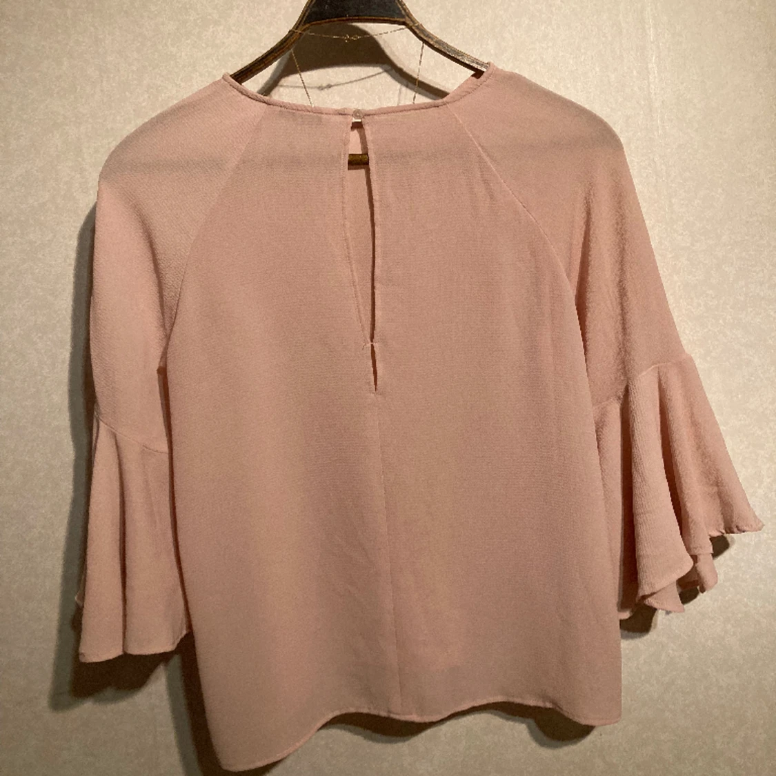 En rosa sötchock med 3/4 volangärm. Fina sömmar, tygkvalité trots användning :) En favorit i min garderob. Strl 36, Stor i storleken
