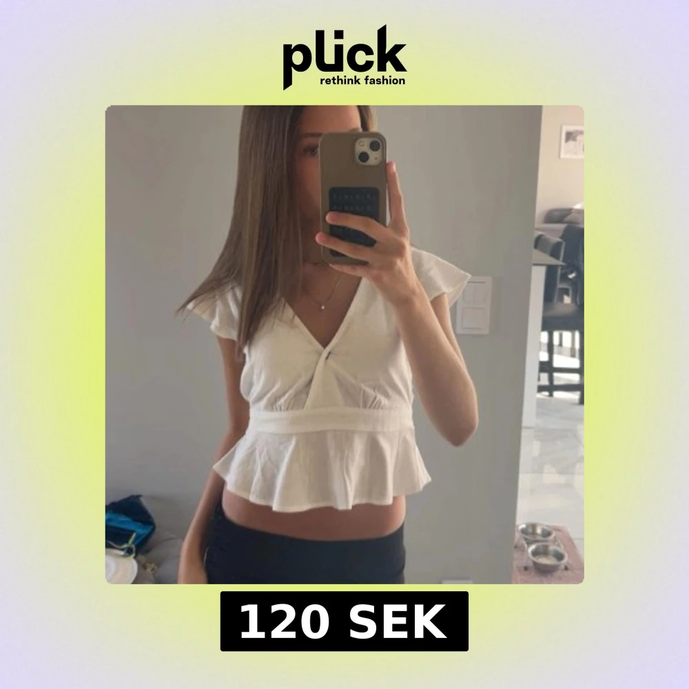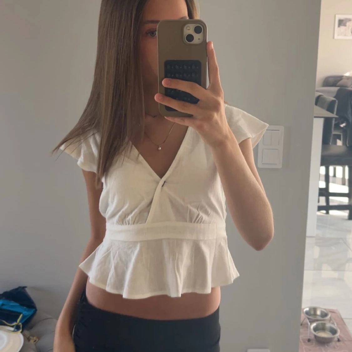 Supervacker och trendig vit blus med volanger vid ärmarna och rosett där bak! (Bild kan skickas vid önskan) Endast använd en gång, då har en säkerhetsnål använts vilket har lämnat ett litet märke som dock knappt syns. Storlek xxs/xs 🩷
