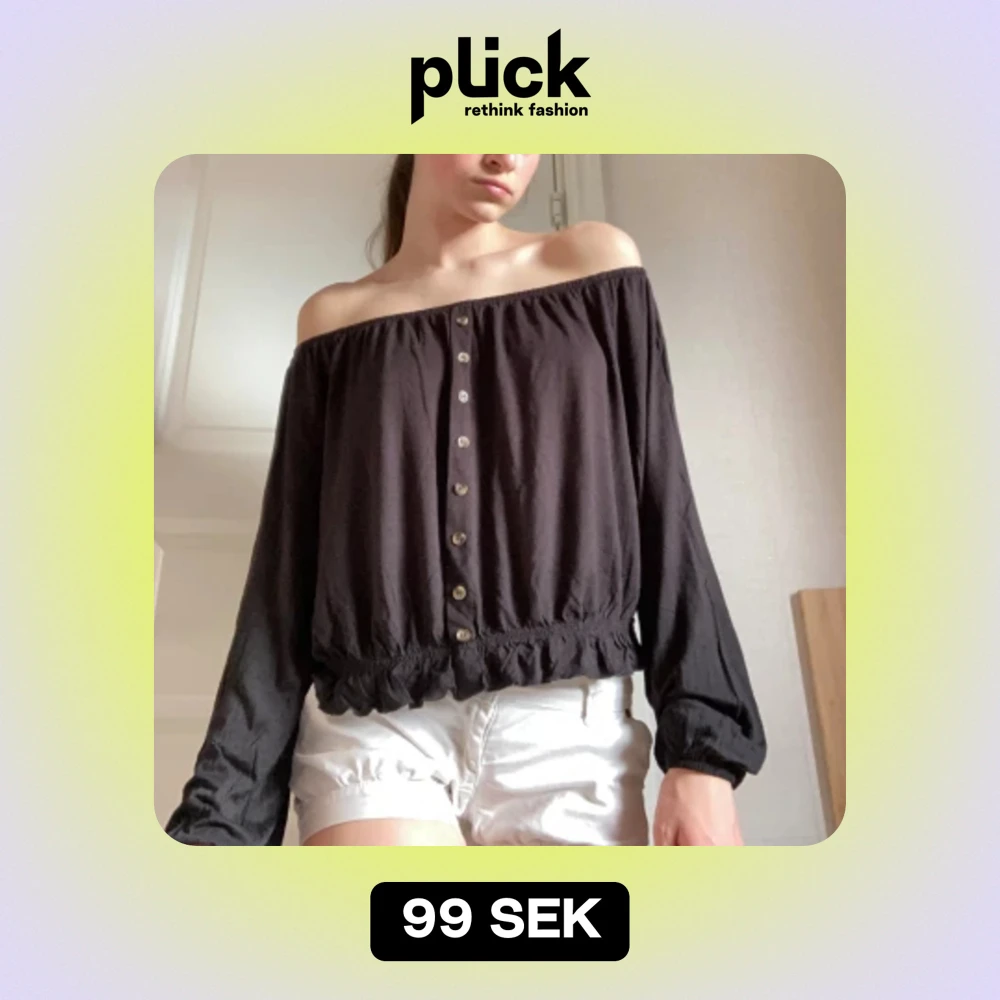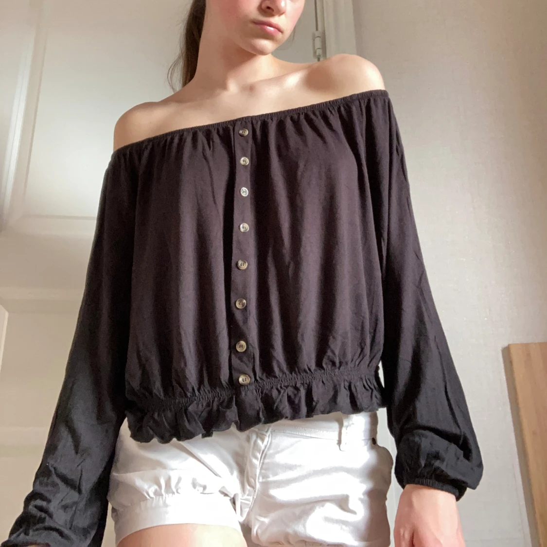Svart has Off shoulder blus med knappar och volanger đž stretchig materialđ«¶đŒ Solen gav en röd nyans i bilden men den Ă€r helt svart utan flĂ€ckar!