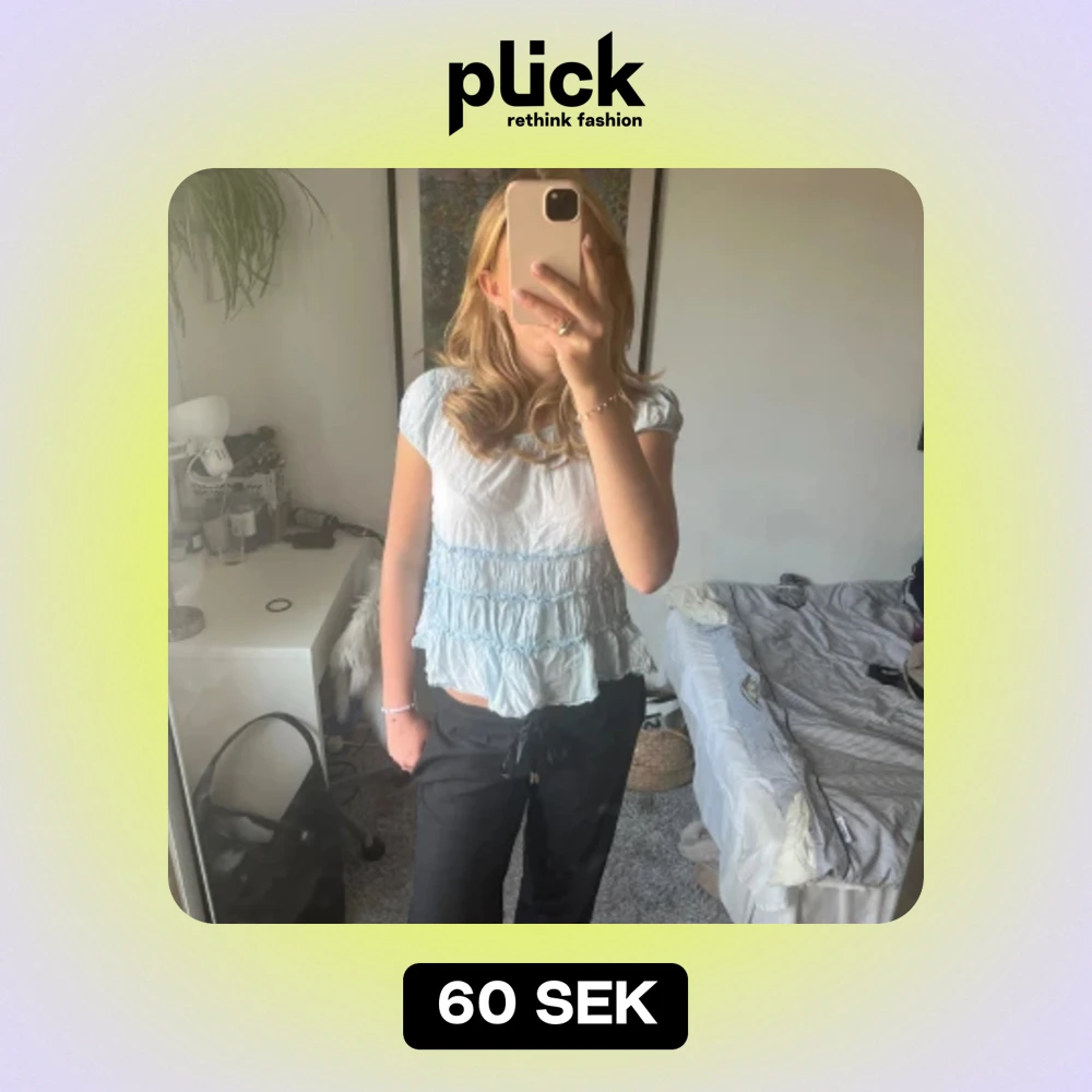Blå blus med volanger, väldigt gammal så vet inte vilket märke. Storlek Xxs-S? På lappen står det 146-152 men passar mig som normalt har Xs-S