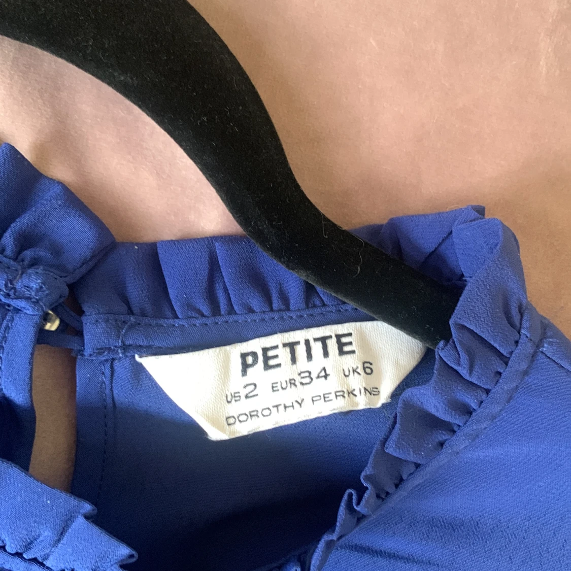 Blå blus i storlek 34 med volangkrage, använd ett fåtal gånger.