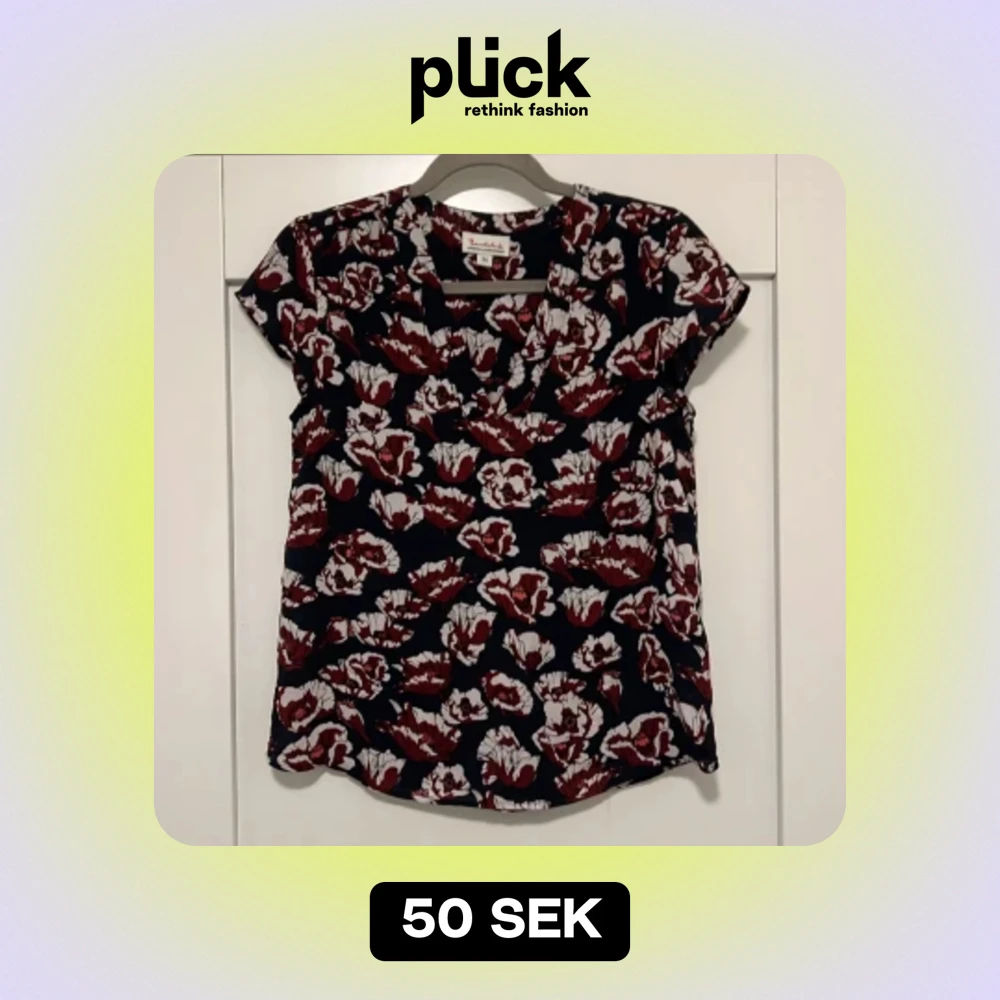 Kortärmad blus från Bondelid. Marinblå med vinröda/vita blommönster. Storlek 36. Liten trådmaska som syns till vänster på sista bilden.