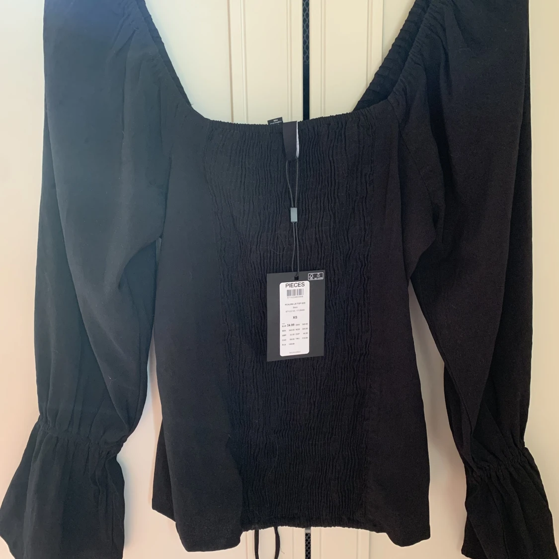 Svart blus med dragsko på bysten med långa snören. Ryggen är smock så den är väldigt stretchig. Aldrig använd, prislappen sitter kvar.