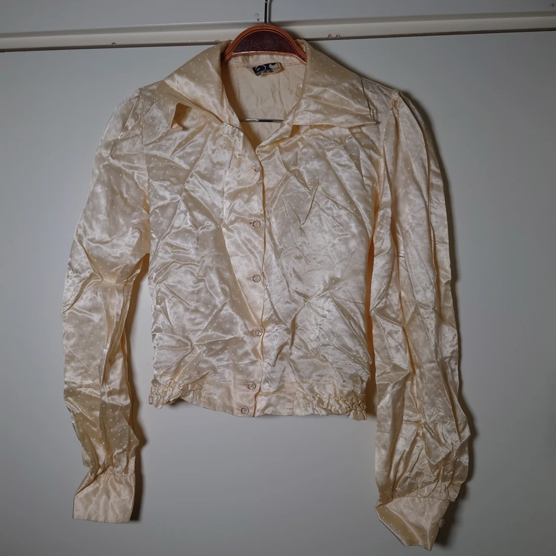 Omöjlig att fånga på bild (speciellt när den är skrynklig efter att ha legat ihopvikt, som här). Men SÅ fin vintageblus i ljus cremegul färg. Materialet är lite som siden. Småprickigt mönster. Resår i nederkant. Storlek 40 men mer som 36/38 tycker jag🌿