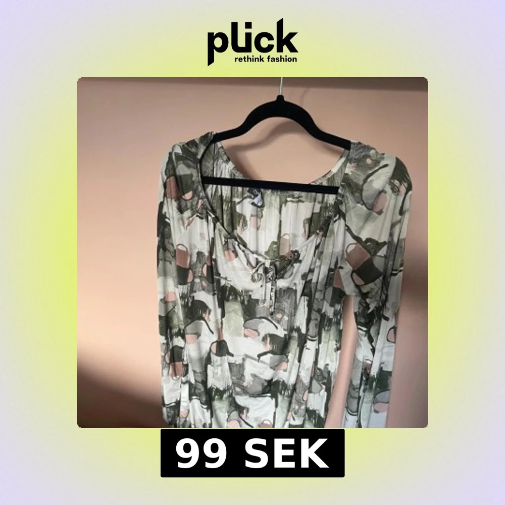 Snygg långärmad blus med abstrakt mönster i grönt, rosa och vitt. Blusen har snörning vid halsringningen och en avslappnad passform. Perfekt för dig som gillar unika prints och bekväma plagg. ❤️❤️