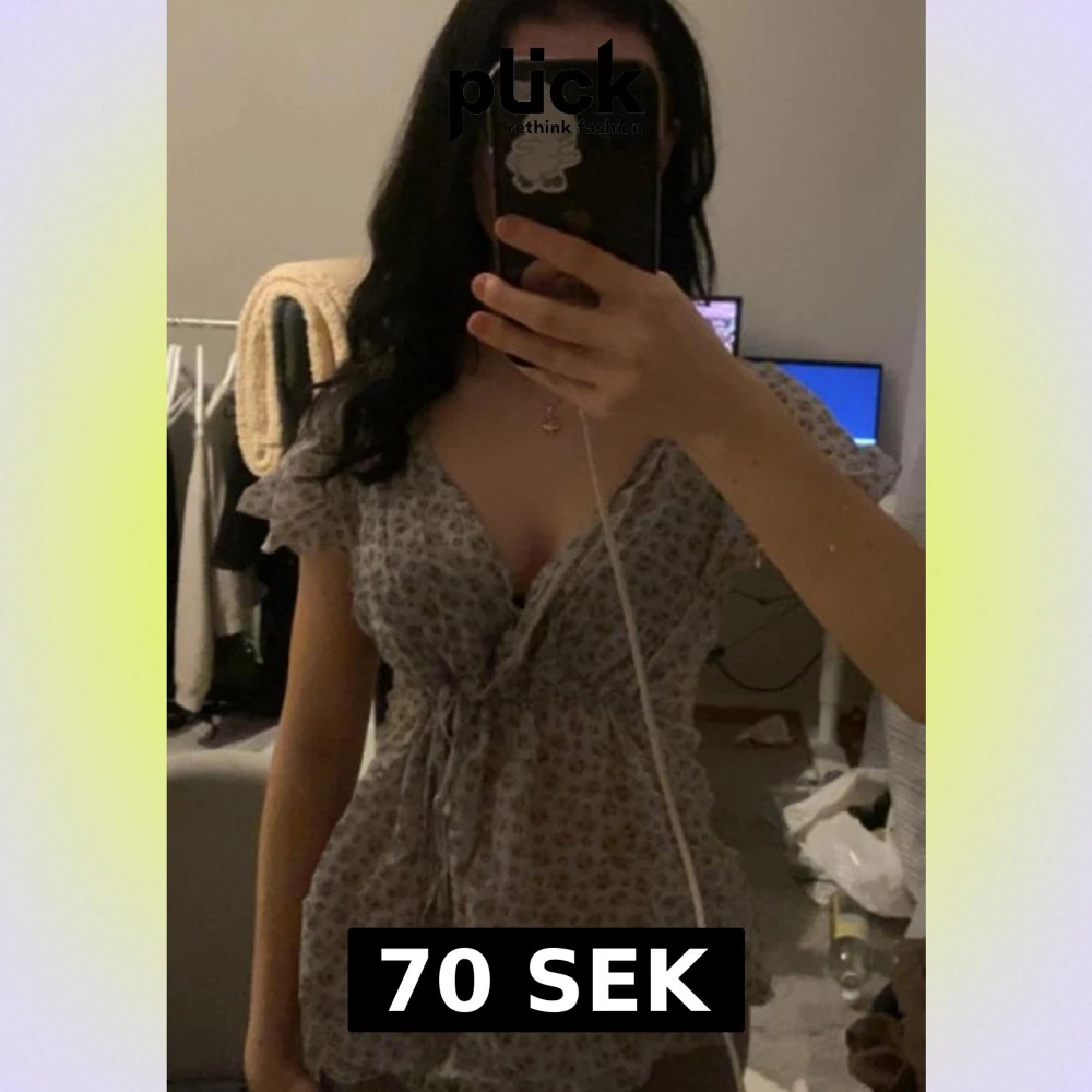 Supersöt vintage blommig blus i ljuslila med små gula och rosa blommor. Djup v-ringning, knyt framtill och volangiga korta ärmar. Tunn och luftig, perfekt för varma dagar. Sitter lite loose och har en romantisk vibe.