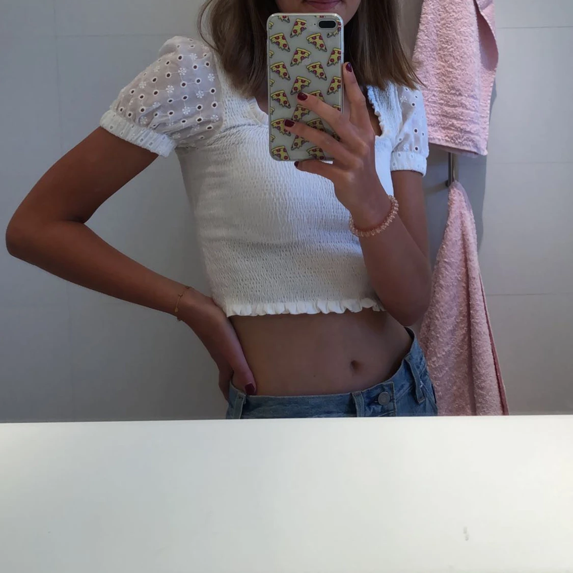 Vit blus som är använd endast ett fåtal gånger och därav i toppskick. Otroligt söt med puffaxlar med mönster.