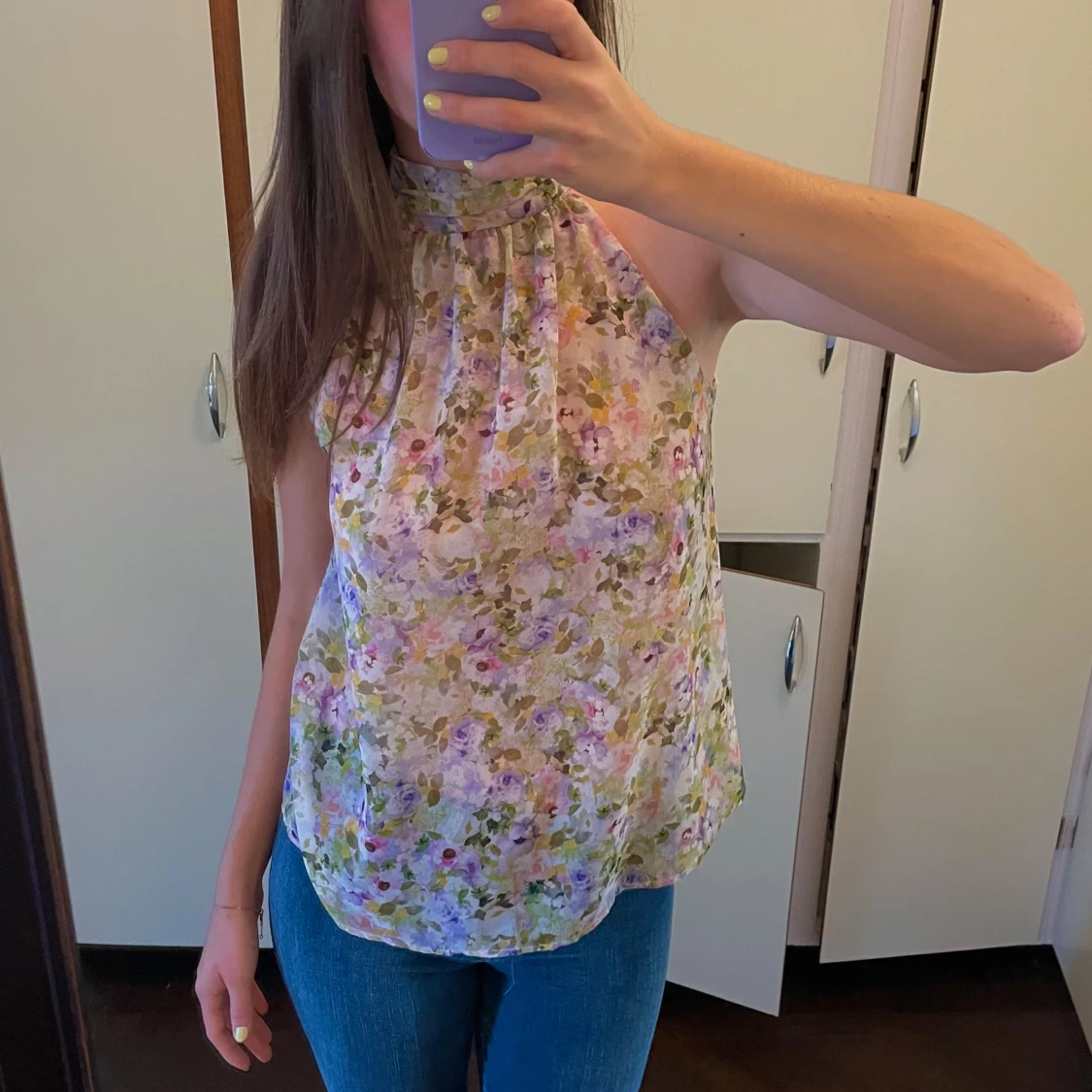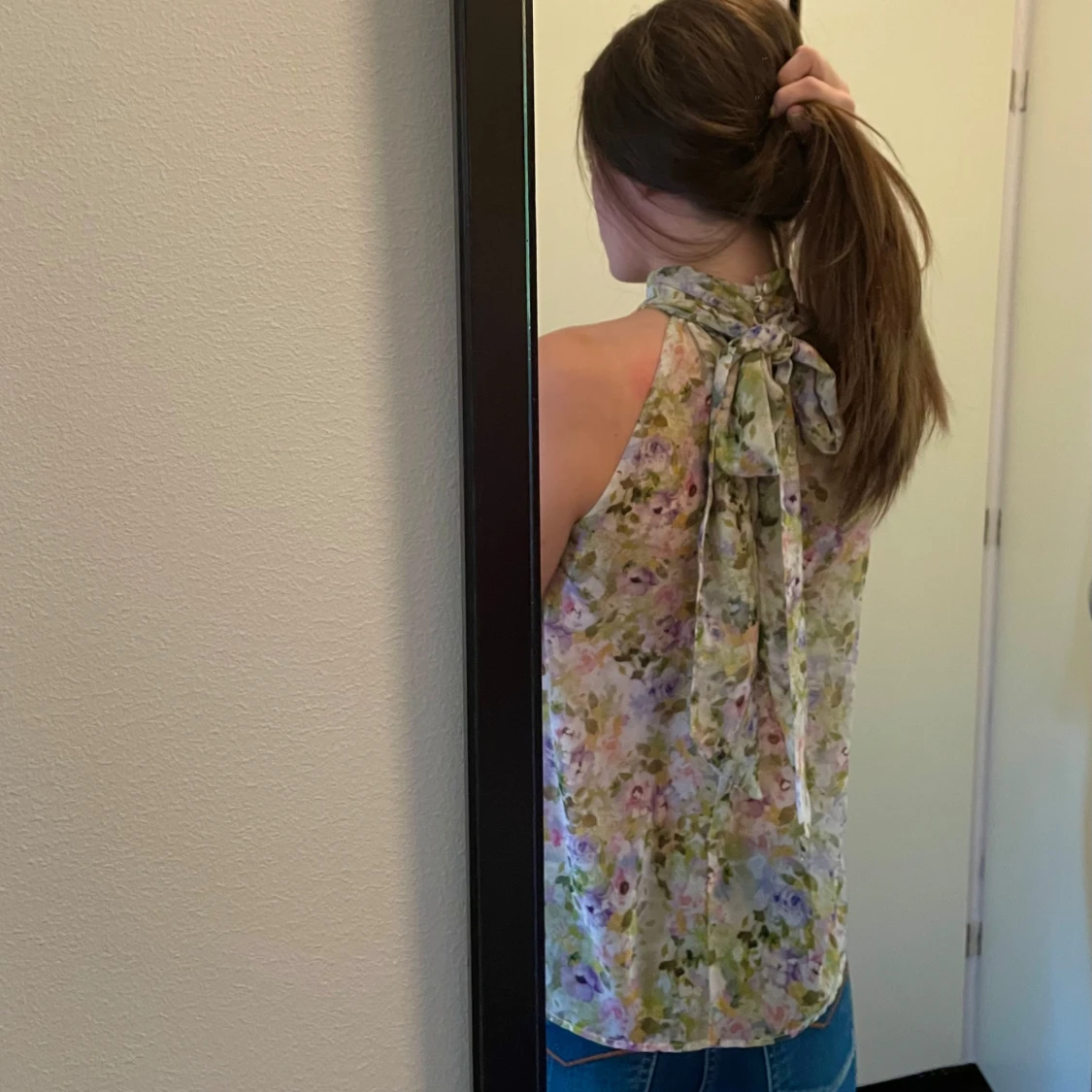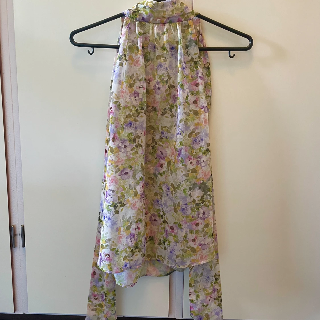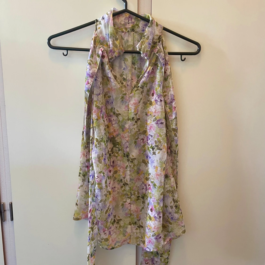 Jättefin blommig blus med hög krage och band att knyta i nacken