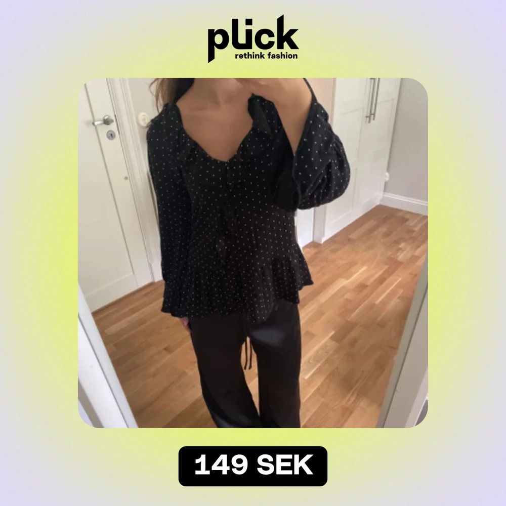 Vit/svart prickig blus från Lindex med volang vid halsen och längst ut på armen. Bra skick, inga defekter.