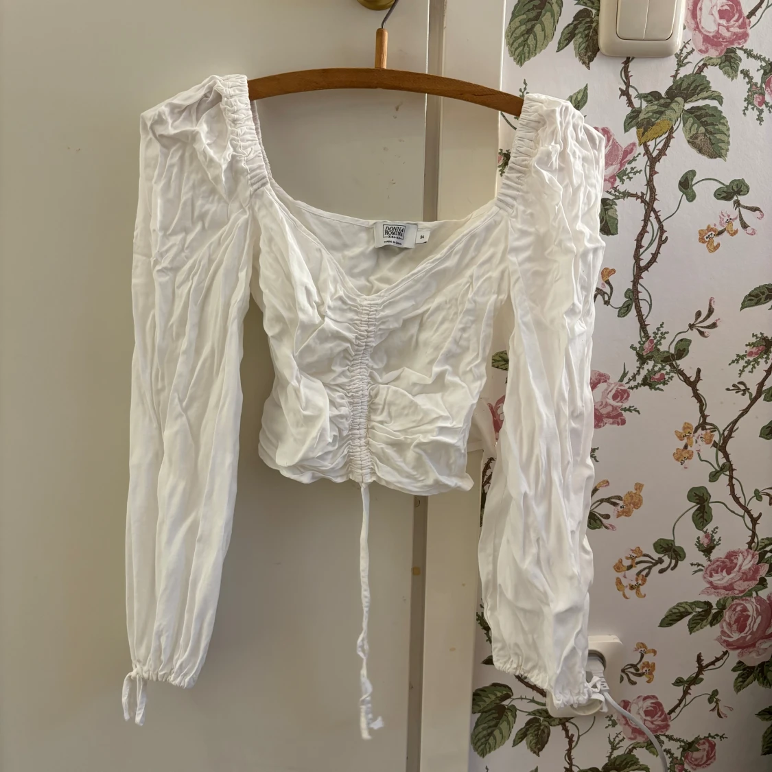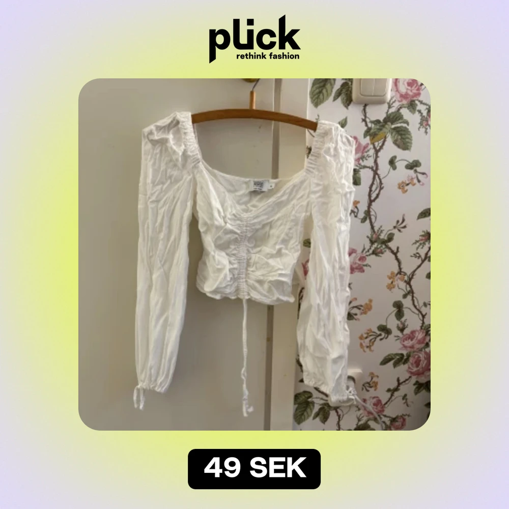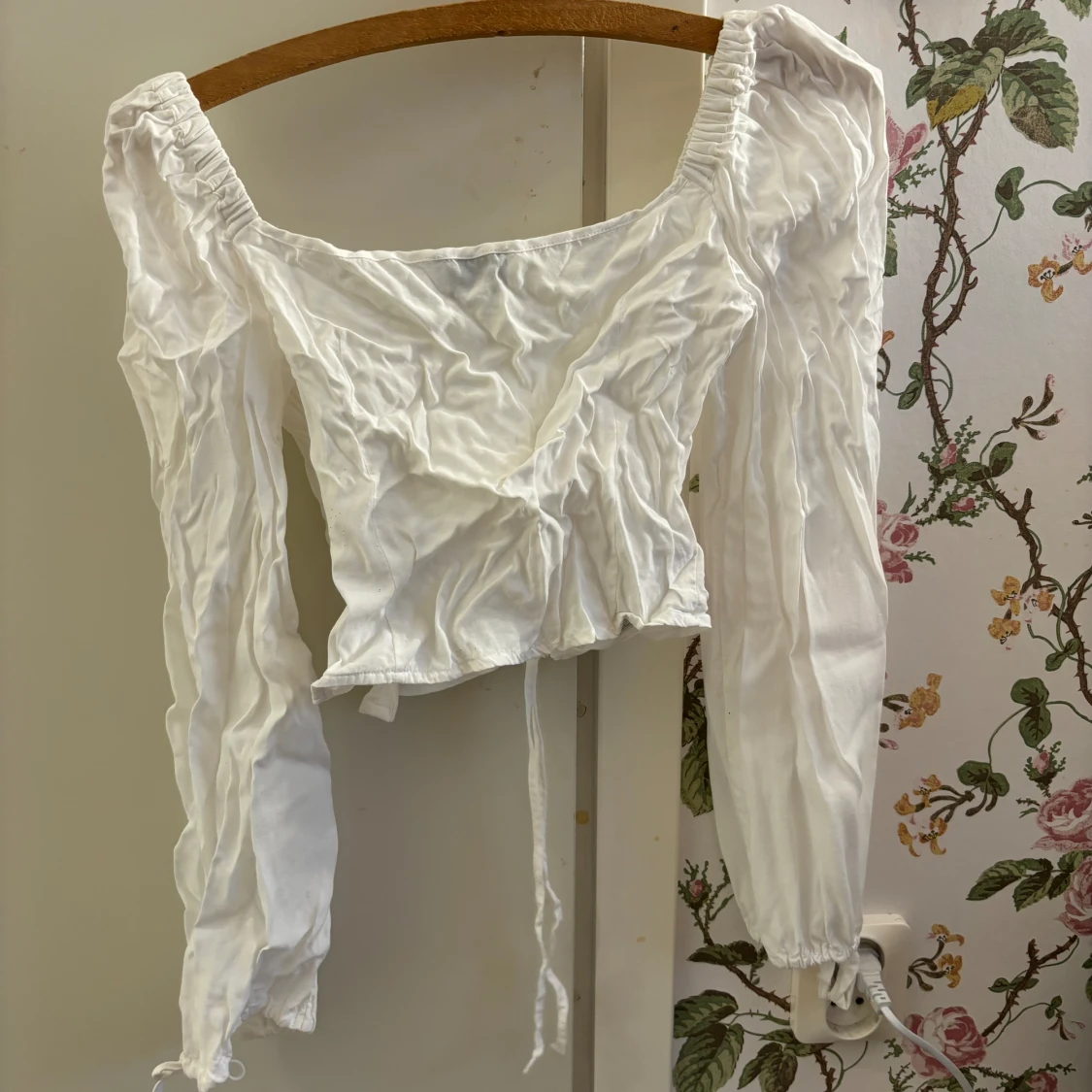 En vit blus från nakd. Med snöre mitt på så man kan reglera längden. Strl 34. Använd 2 ggr för 3/4 år sedan och sen har den fått ligga i garderoben.