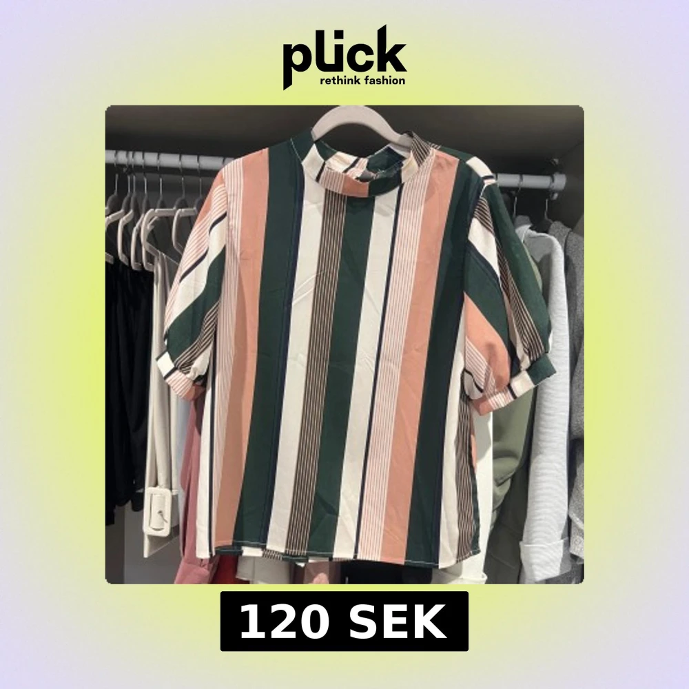 Snygg blus med breda vertikala ränder i grönt, vitt, rosa och beige. Modellen har korta ärmar, rak passform och en liten ståkrage med knapp i nacken. Perfekt för dig som gillar färg och grafiska mönster. Strl S/M
