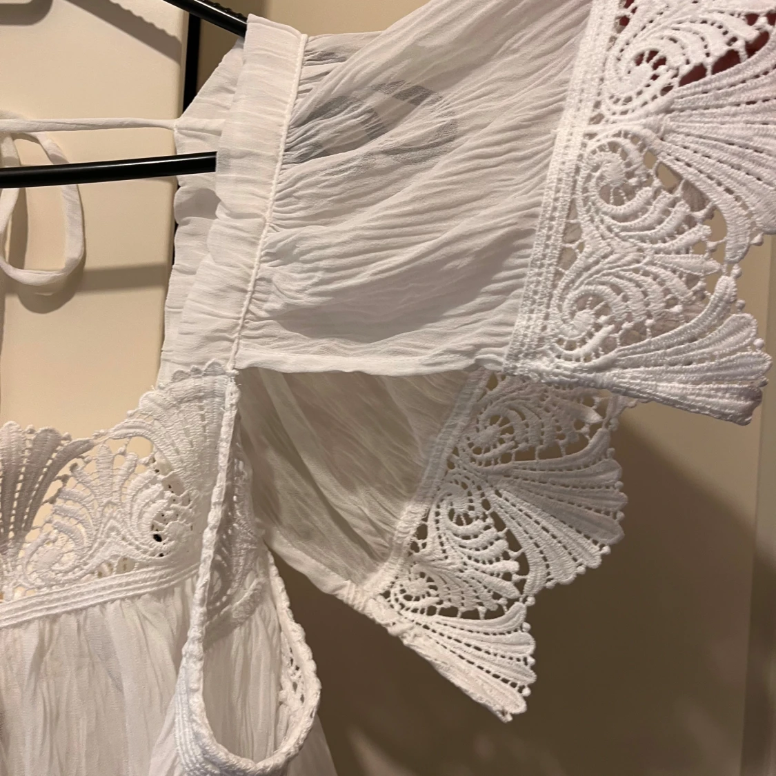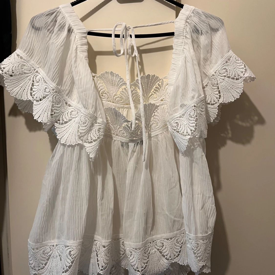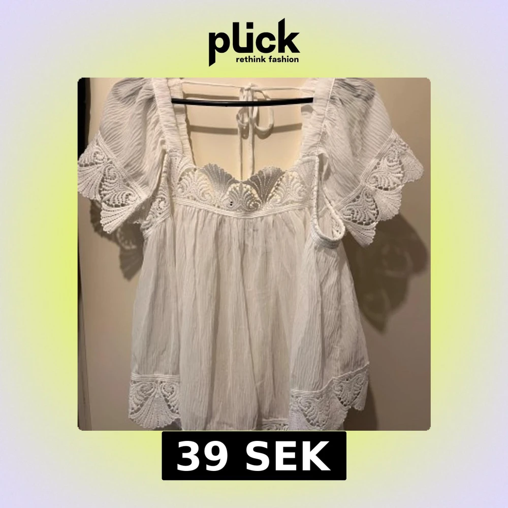 Helt ny blus i strl 40/42. Knytning baktill. Tyget är lite genomskinligt. Material: polyester och bomull Skulle säga att storleken är en 40, och inte 42.