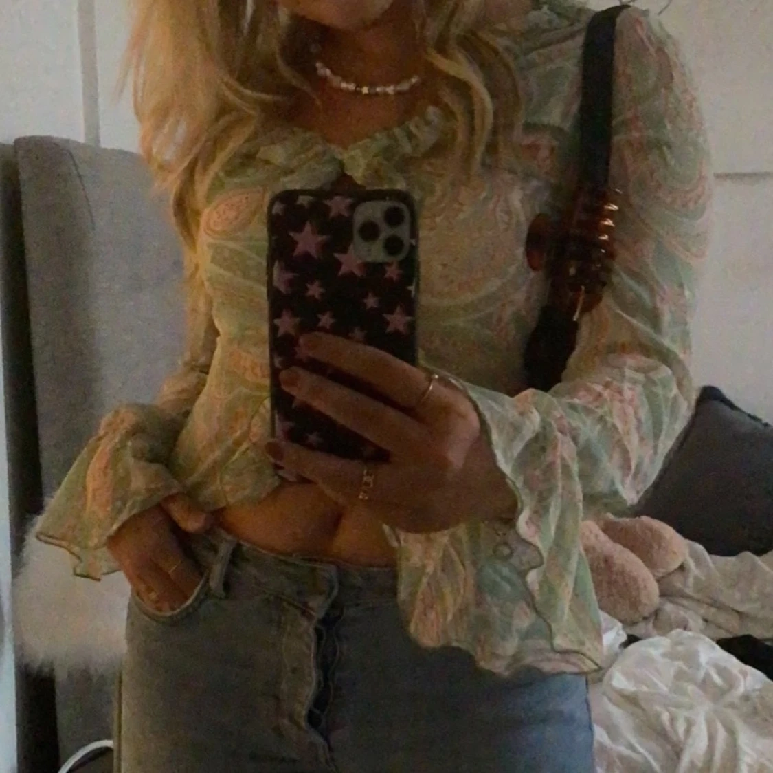 En cool blus med grönt och rosa mönster🌟 i storlek M köparen står för frakten ❤️