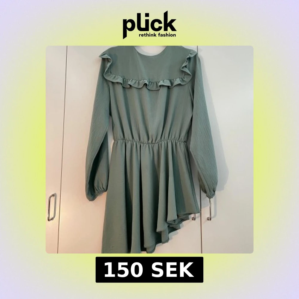 Supersöt mintgrön blus med volang längs bröstet och långa ärmar. Klänningen har resår i midjan och ett flowy fall med asymmetrisk nederdel. Perfekt för dig som gillar en feminin och trendig stil. På tredje bilden ser man att vänsta armen har en liten skada men är ej synlig från långthåll. Storleken är 42 på plagget men är väldigt liten i storlek, pga köpt utomlands, den skulle passa bäst någon med storlek M. Priset kan diskuteras.