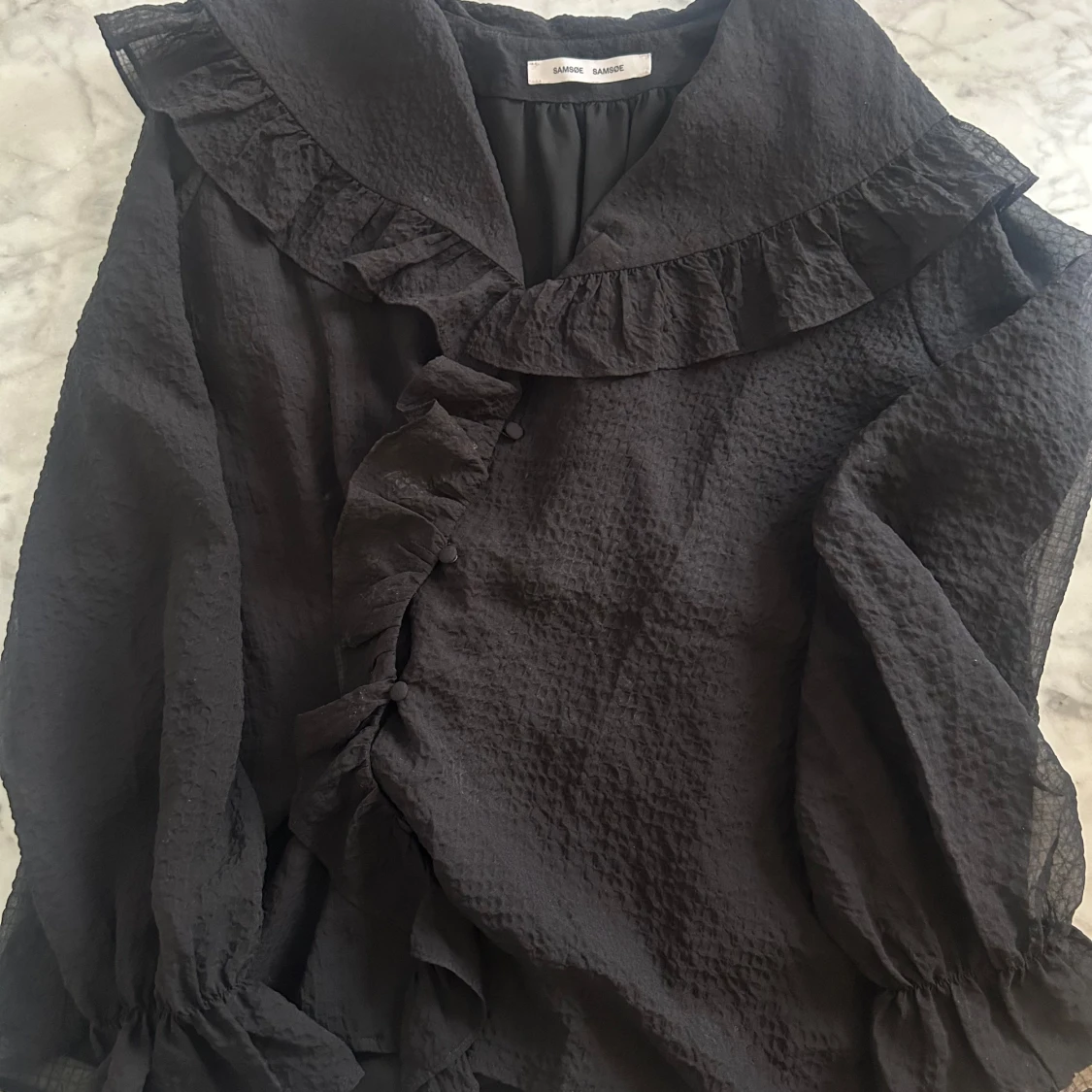Svart, volangblus från Samsoe Samsoe. Köpt i Köpenhamn i somras för 800kr. Passar till allt!!! Så skön och snygga detaljer. Skriv för fler bilder;) Knappt använd!