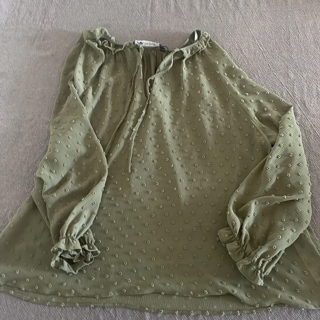 Säljer min helt nya zara blus, jag har aldrig använt den då den var för lång för mig tyvärr. Jag är 167 och den går precis över rumpan vilket jag inte föredrar. Den är i en oliv grön färg och är slutsåld.