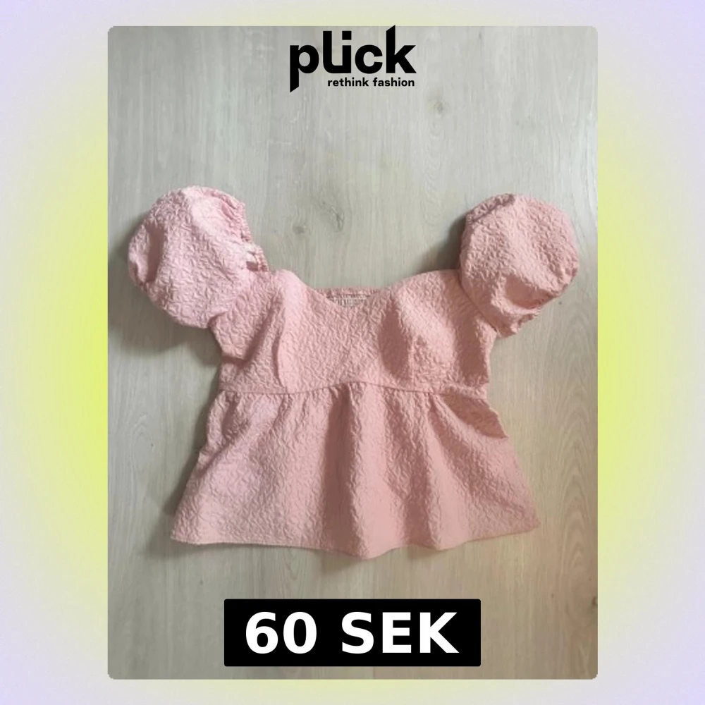 Supersöt ljusrosa blus med puffiga korta ärmar och strukturerat tyg. Blusen har en v-ringad hals och smock i ryggen för extra komfort. Den har en volang nedtill som ger en markerad midja. Blusen är kortare i modellen och i topp skick, aldrig använd!
