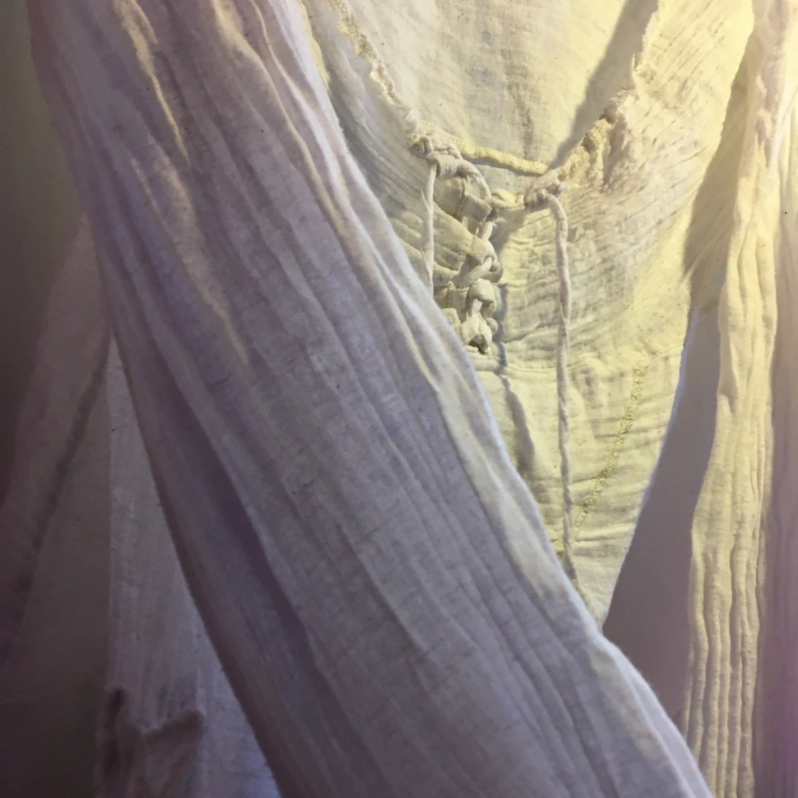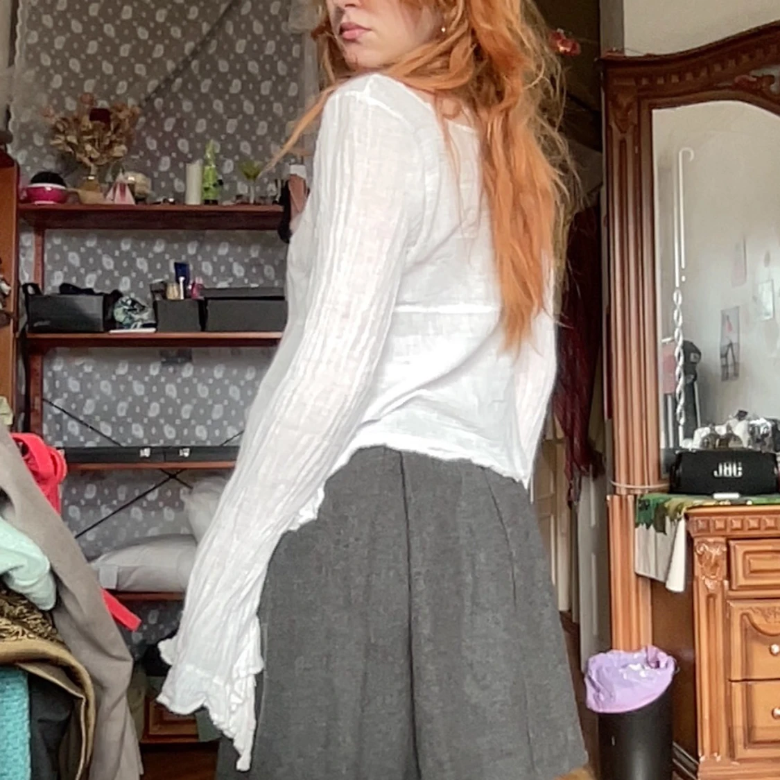 Vit mjuk blus med lång ärm och snörning framtill. Blusen har en lätt och luftig design med en subtil struktur i tyget. Längd: ca 50cm Bredd: 38,5cm Ärm: 68cm