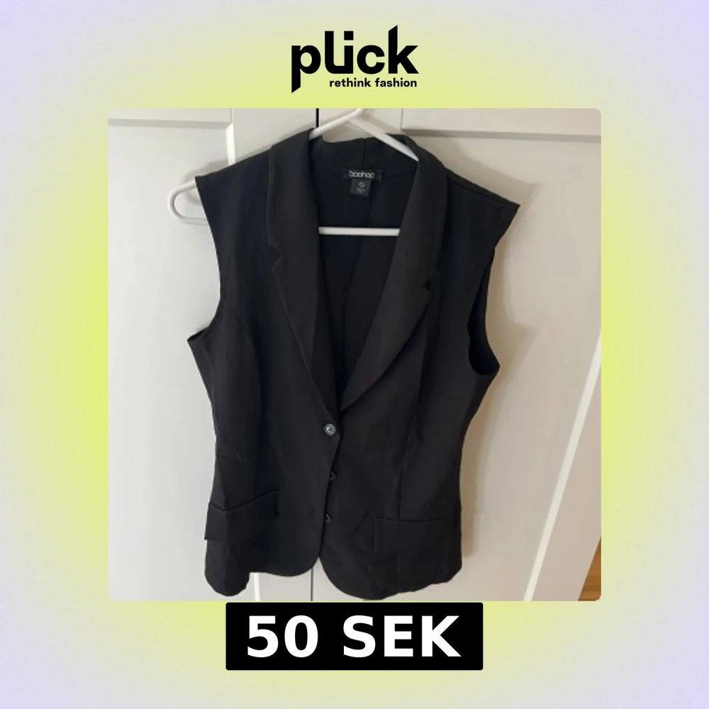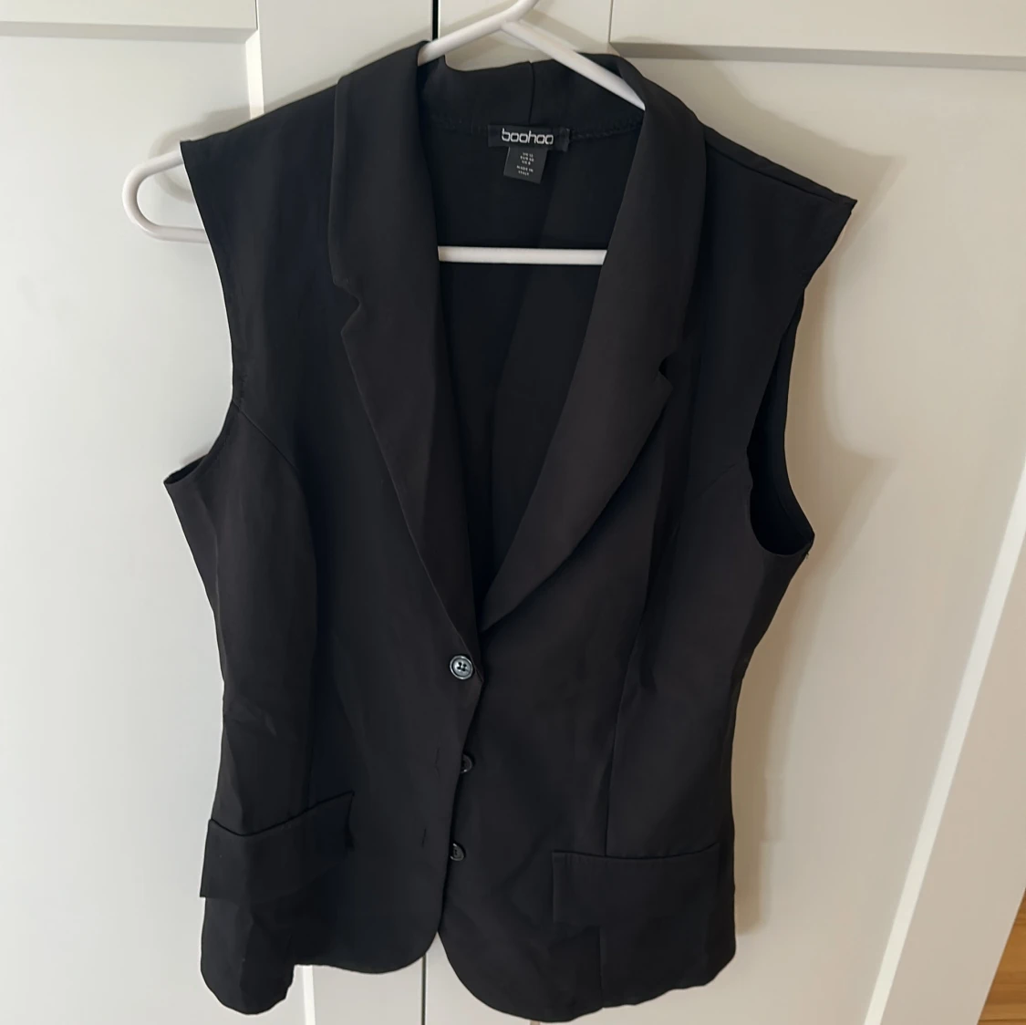 Stilren svart väst med klassisk krage och knäppning framtill. Oavsvänd