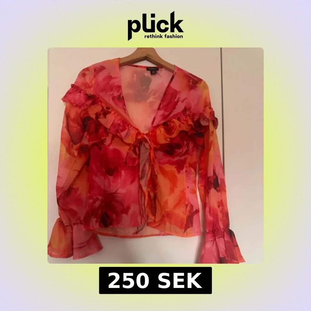 Det här är en tunn, blommig blus från Boohoo i transparent tyg. Den har ett färgstarkt mönster i rosa, rött och orange toner. Blusen har en djup V-ringning med volanger längs bröstet och knytning framtill. Ärmarna är långa och vida med volanger vid ärmsluten. En feminin och somrig topp med en romantisk känsla. Typ helt ny och bara använt 1 gång