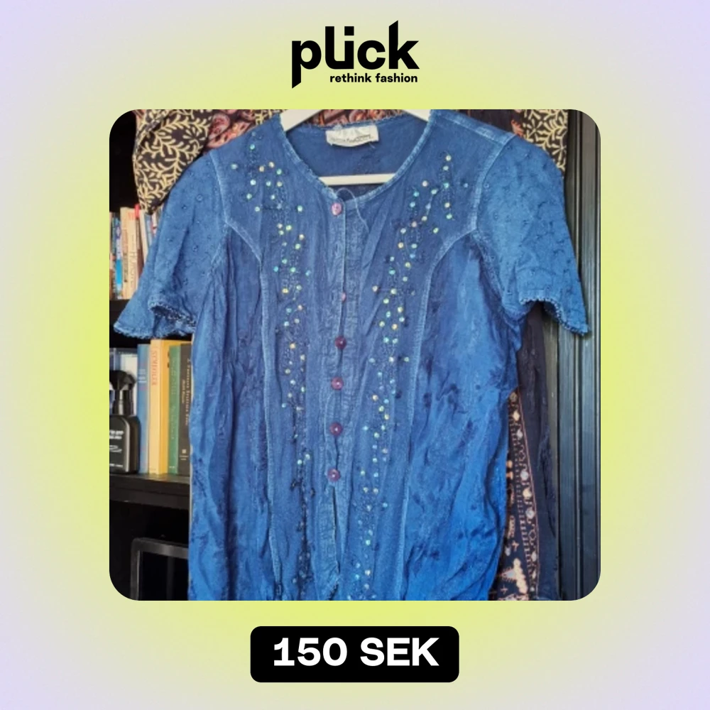 Broderad blå tröja med paljetter. Lite lösa trådar här och där men är inte särskilt synliga. Slutar ungefär vid naveln. Storlek S-M.