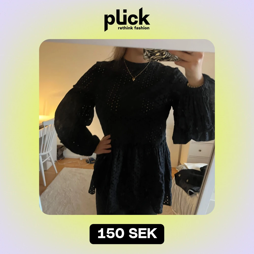 Säljer en superfin svart blus med broderade detaljer. Den har långa puffiga ärmar och en lös längre passform. 🖤