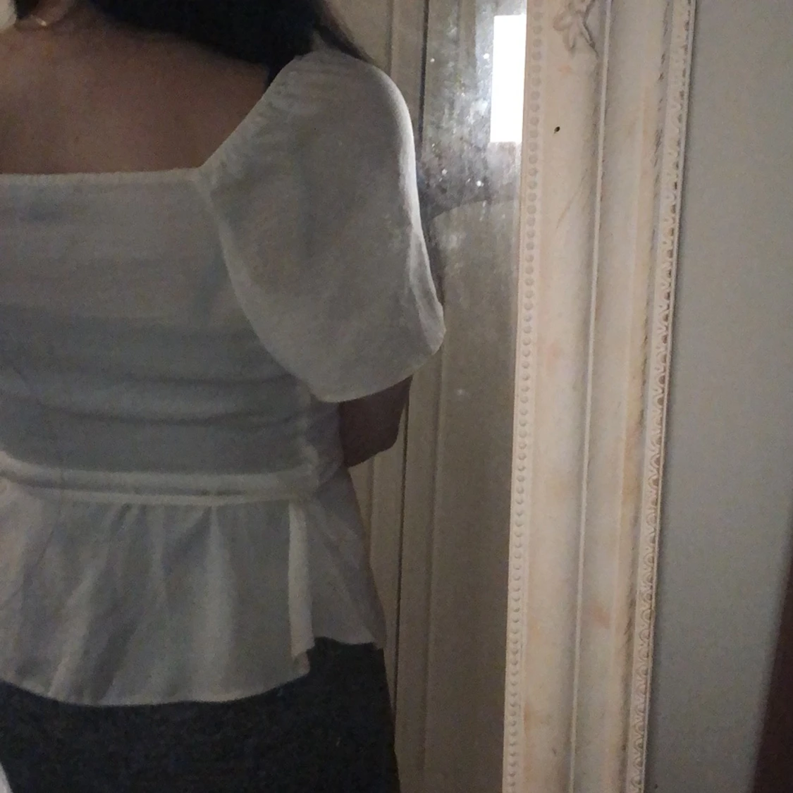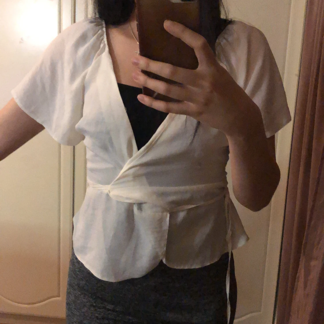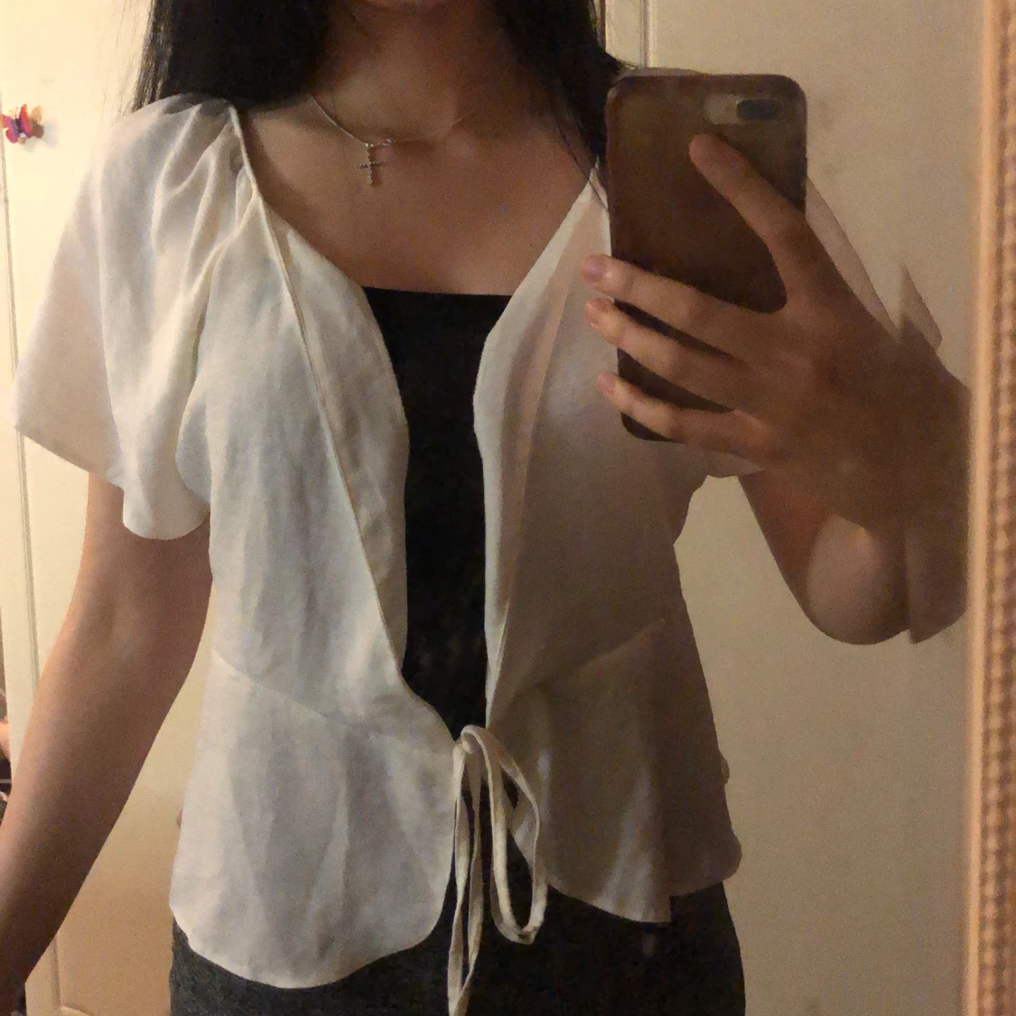 En jättsöt kortärmad blus med snören, det finns olika sätt att knyta den på vilket jag även gör på bild 2🤍 den är i nytt skick då jag använt den sparsamt ett fåtal gånger