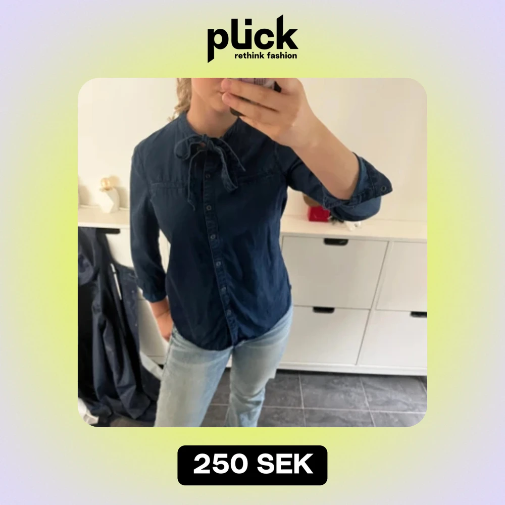 Super cool blus i jeans material med rosett som går att knyta vid kragen💕 blusen är från esprit och är i gott skick💗