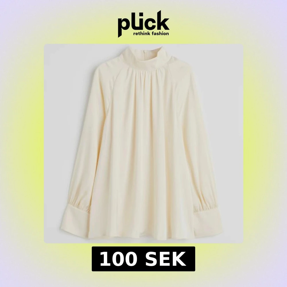 Hög hals och ballongärmar. Satintyg. Ganska stor i storlek. Är mer som en M.
