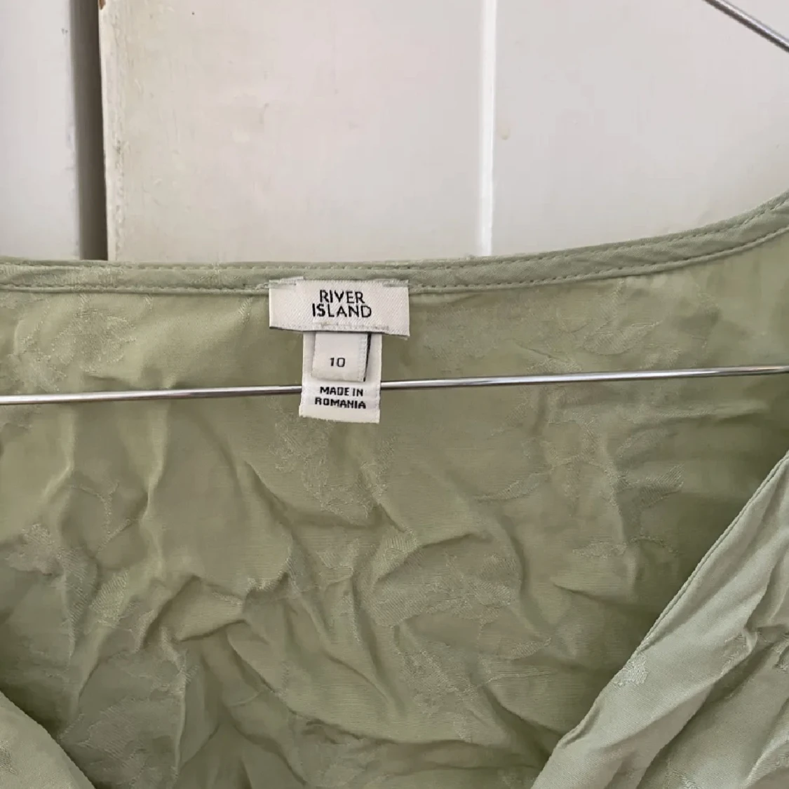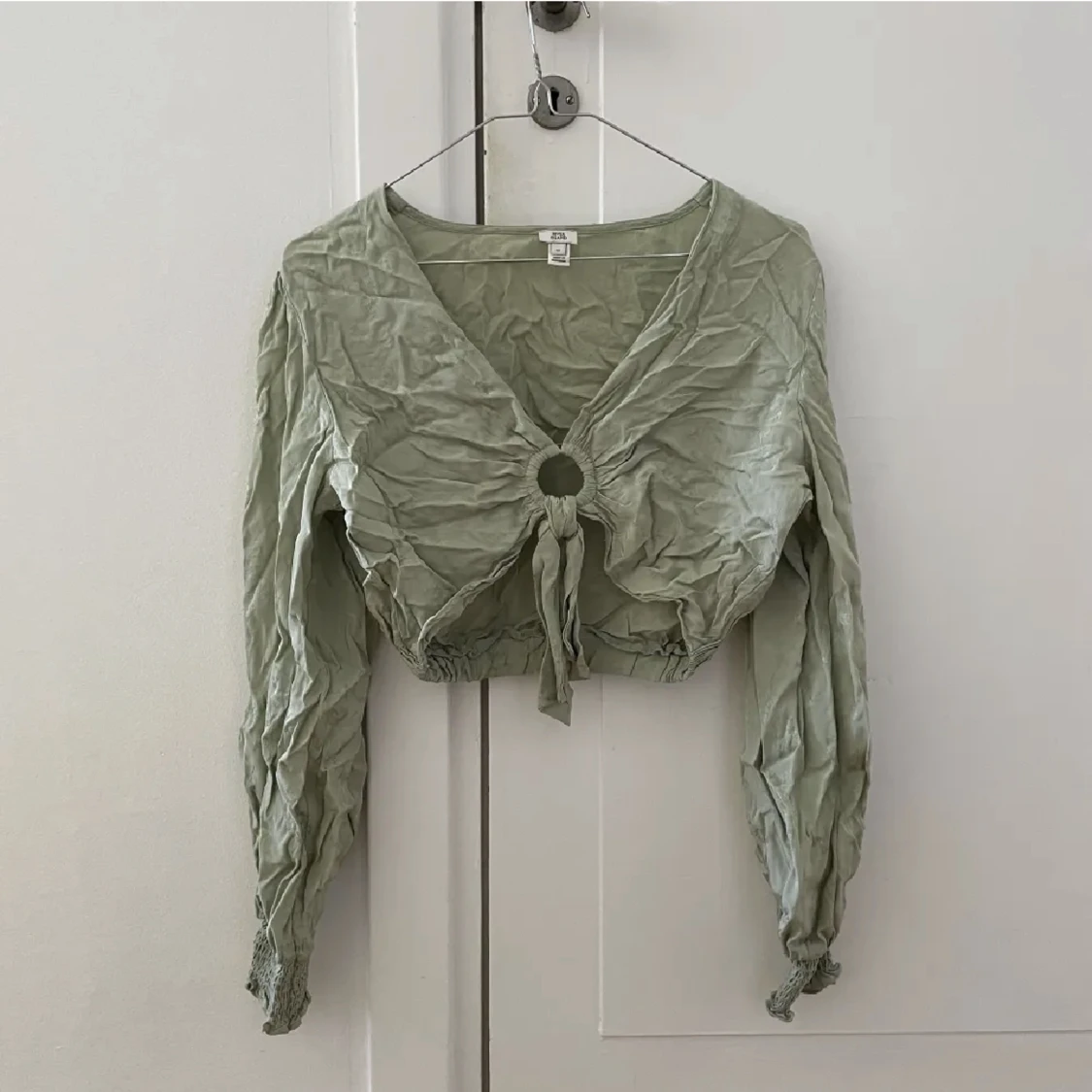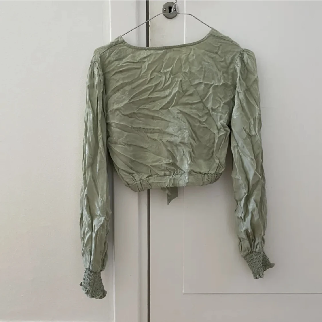 Långärmad croptop i salviagrönt. Diskret fint mönster, djup urringning och dekorativ knytning framtill. Knappt använd, men nytvättad och behövs strykas hehe.