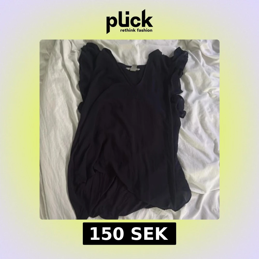 Säljer en mörkblå tröja i storlek M med v-ringning och volangdetaljer vid ärmarna. Klänningen har en luftig och lätt känsla, perfekt för varmare dagar. Enkel och stilren design som passar till många tillfällen.