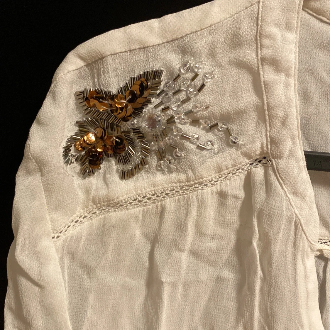 Vit blus med detaljer på axlarna, den är inte struken men går att stryka.