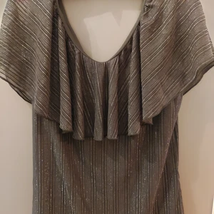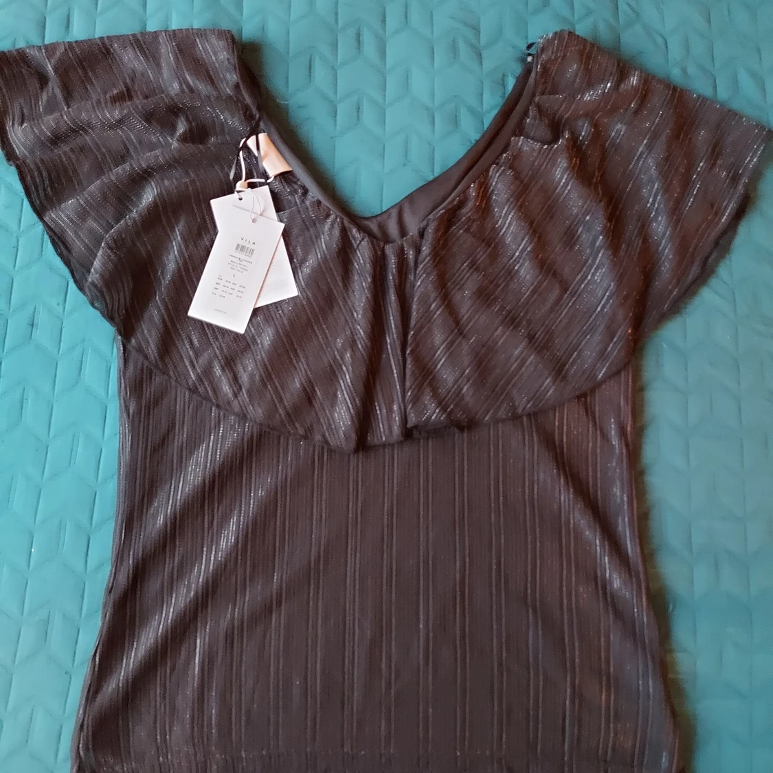 Brand new blouse. Never worn, with price tags in place. Clean, no defects. Coal black fabric with subtle dark shiny thread (in the pictures, under artificial lighting, it looks faded, but it is not). Beautiful Spanish neckline. Double layered. Fabric: polyamide, polyester, elastan blend (see tags). Size: L (40/42)