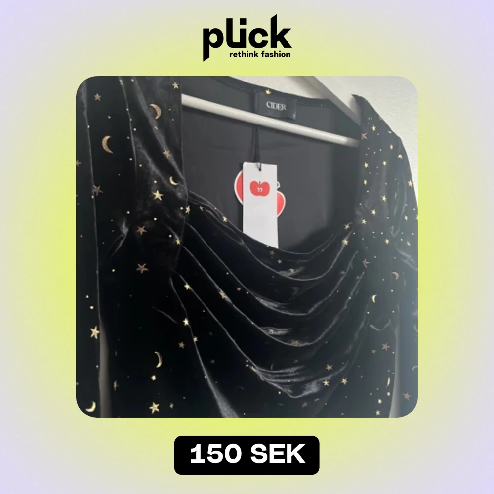 Superfin blus tÀnkt att ha till Eras tour. OanvÀnd. Svart sammetstopp med guldiga stjÀrnor och mÄnar. Fyrkantig urringning ocxh utsvÀngda armar. Midnights tema!! Storlek L men mer som en M