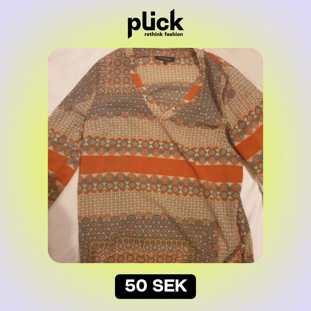 En vacker blus med ett mönster i orange, beige, blått och grönt. Blusen har en V-ringning och tre fjärdedelsärmar. Super fin är inte använd säljer för 50