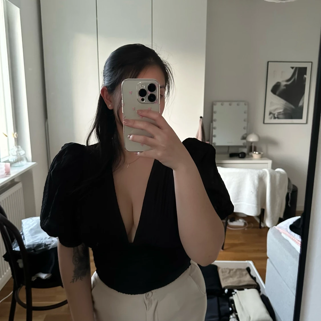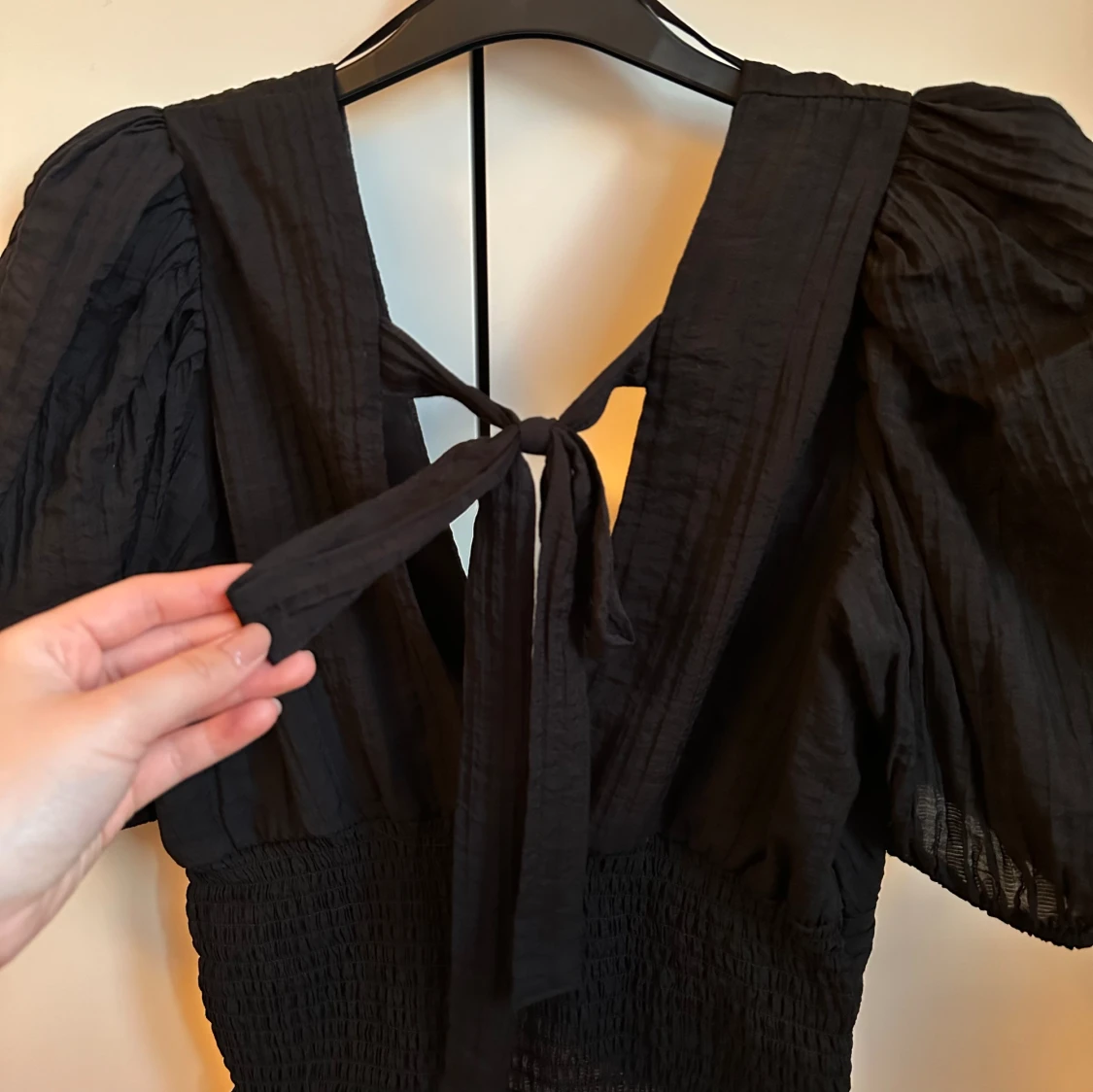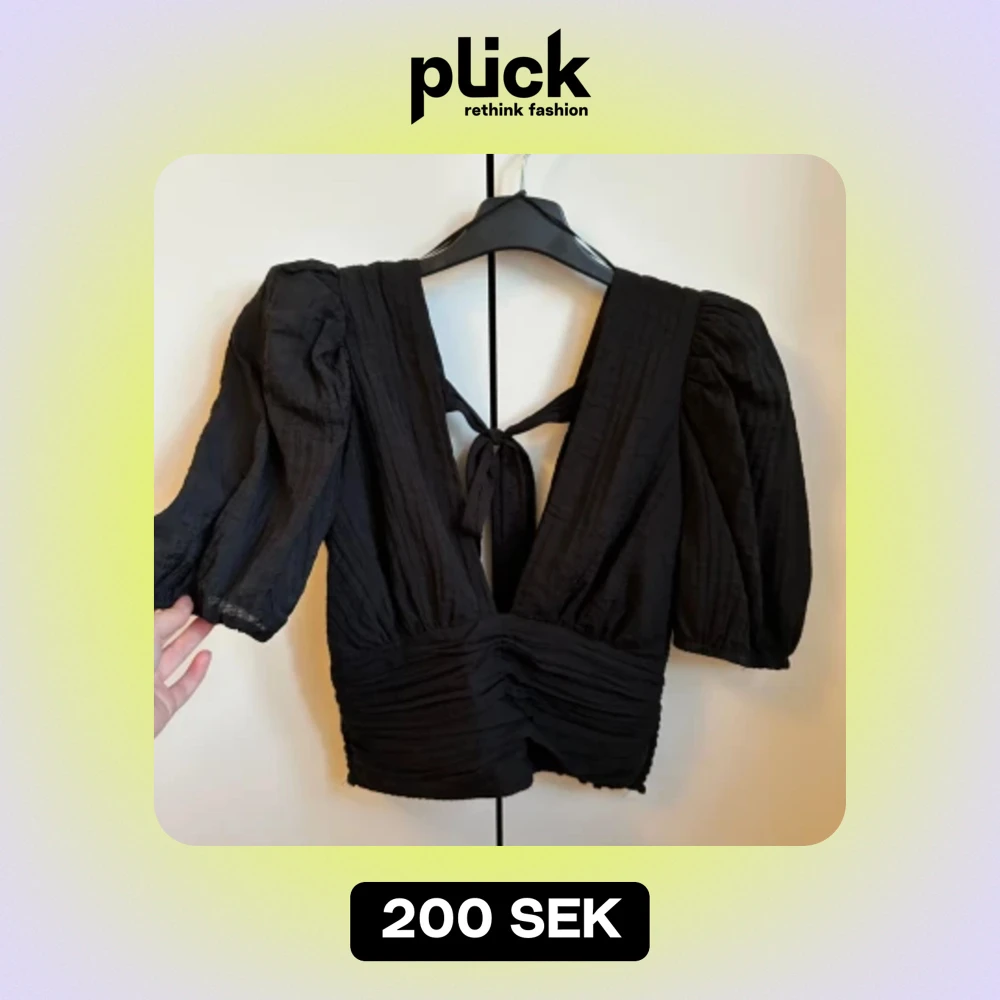 Super snygg fest topp med lite djupare urringning, ballongärm och knytning i ryggen. Lite luftigare material. Använd vid ett tillfälle, jättefint skick! 🖤 Nypris 399kr