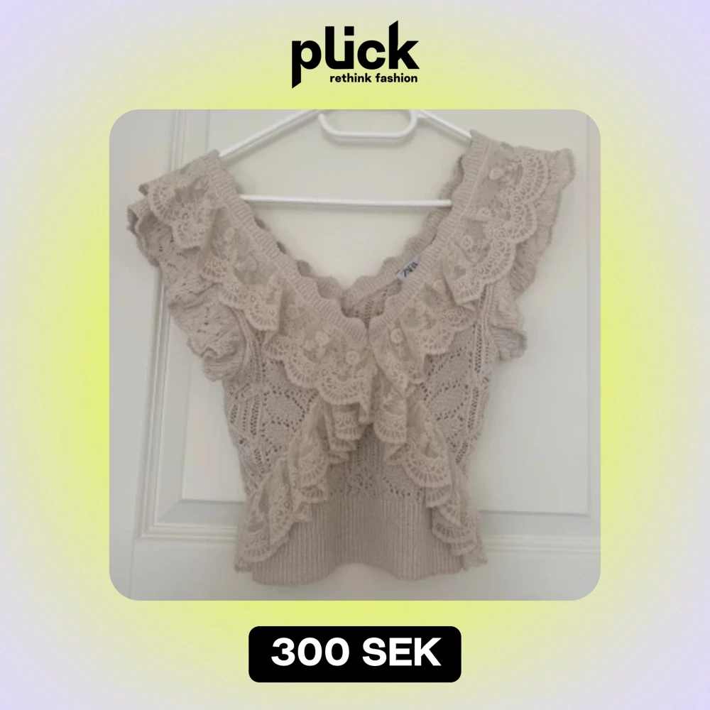 Storlek: S ”Smuts vit färg” Knappt använd (Ca 2-3 gånger bara) Kostade ca 400kr Stretchig blus med spets och volanger