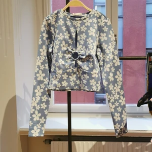 Croptop with long sleeeve and cutouts, in blue-white flower jacquard. Sample from a closing design office.