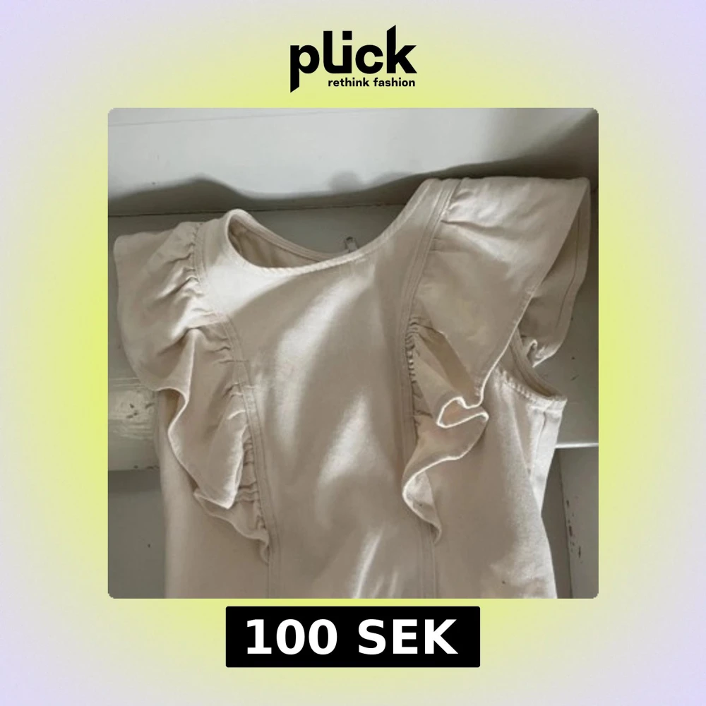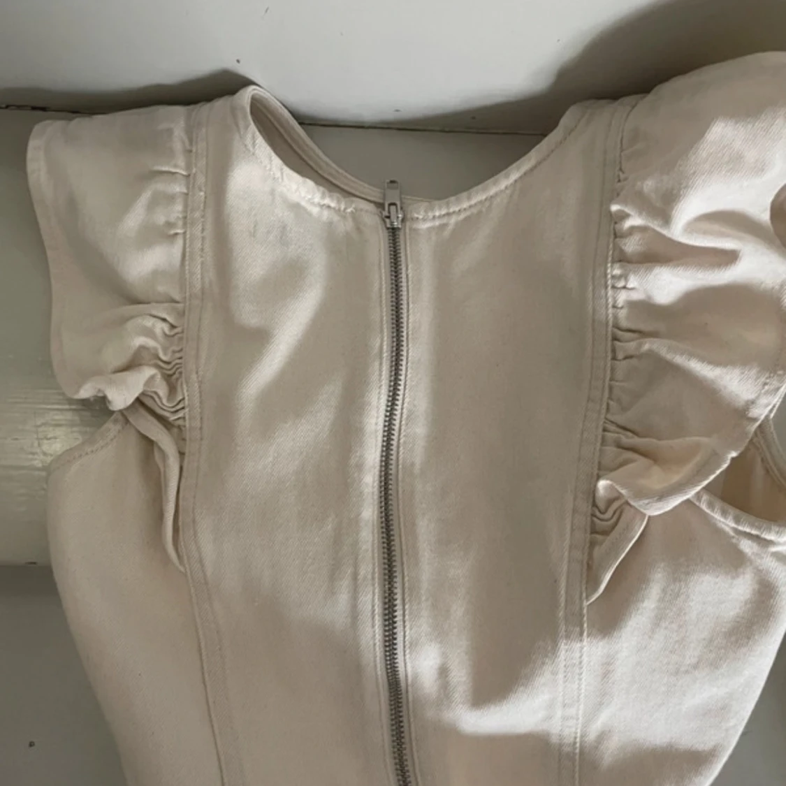 Supersöt beige blus med volangdetaljer på axlarna och dragkedja i ryggen. Ärmlös modell med rund halsringning och mjukt bomullstyg som känns skönt mot huden. Perfekt för dig som gillar en stilren men ändå lekfull look.