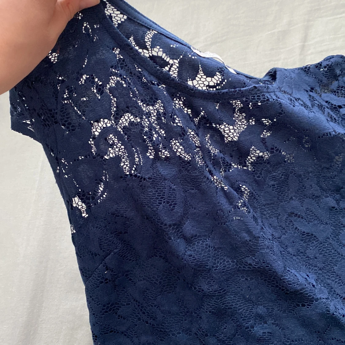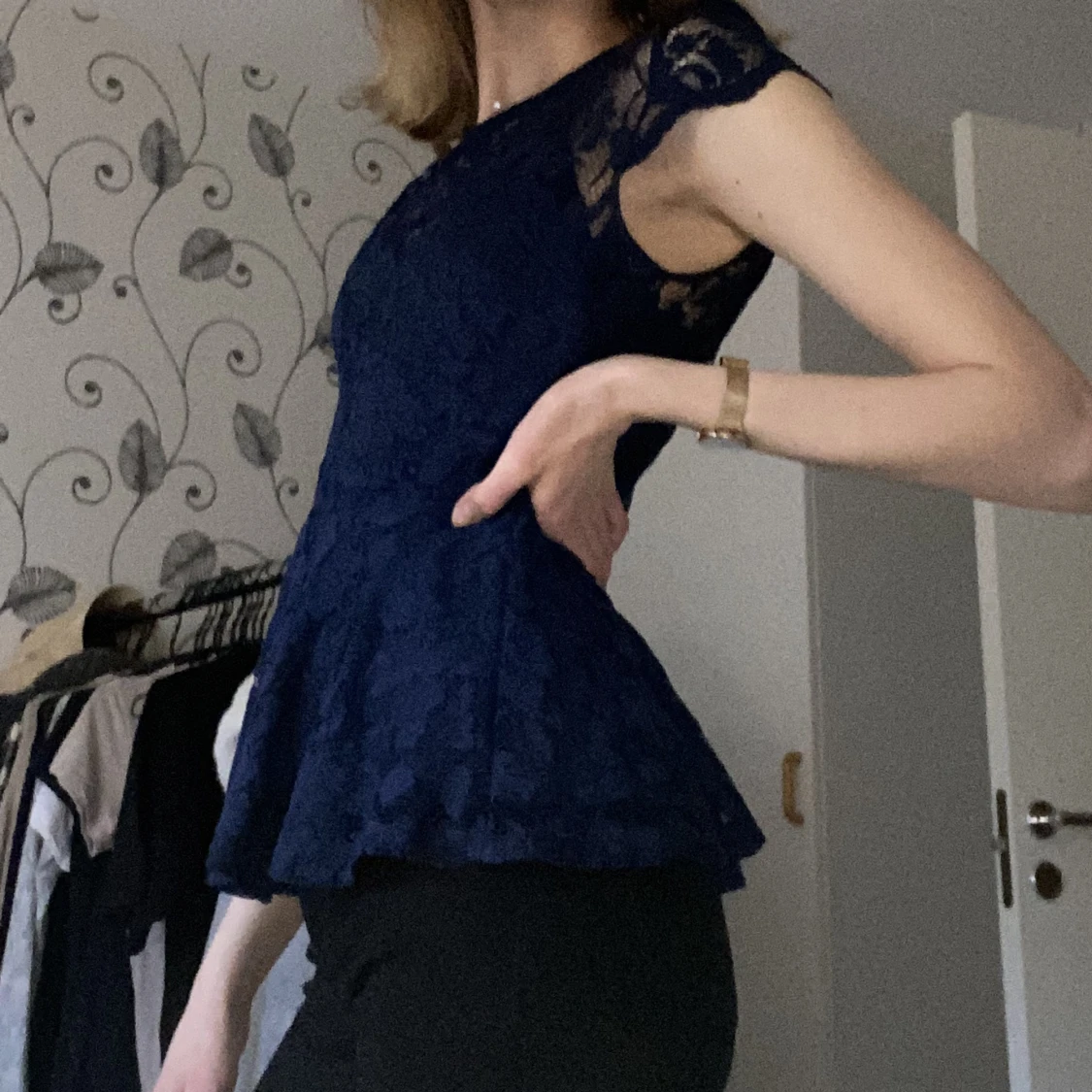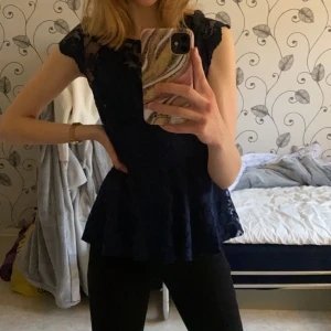 Marinblå topp i spets med volanger från Gina Tricot! 💙Stretchig i materialet och väldigt skön. Den är inte genomskinlig och väl använd, men inte med något fel!