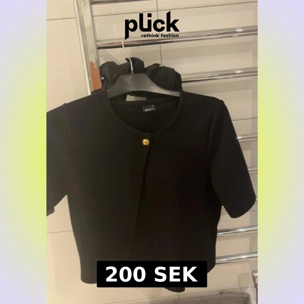 Säljer en stilren svart kofta från Gina Tricot med korta ärmar och rund halsringning. koftan har en snygg guldfärgad knapp framtill och är gjord i ett mjukt material som känns skönt mot huden. Perfekt att styla över en t-shirt eller linne.