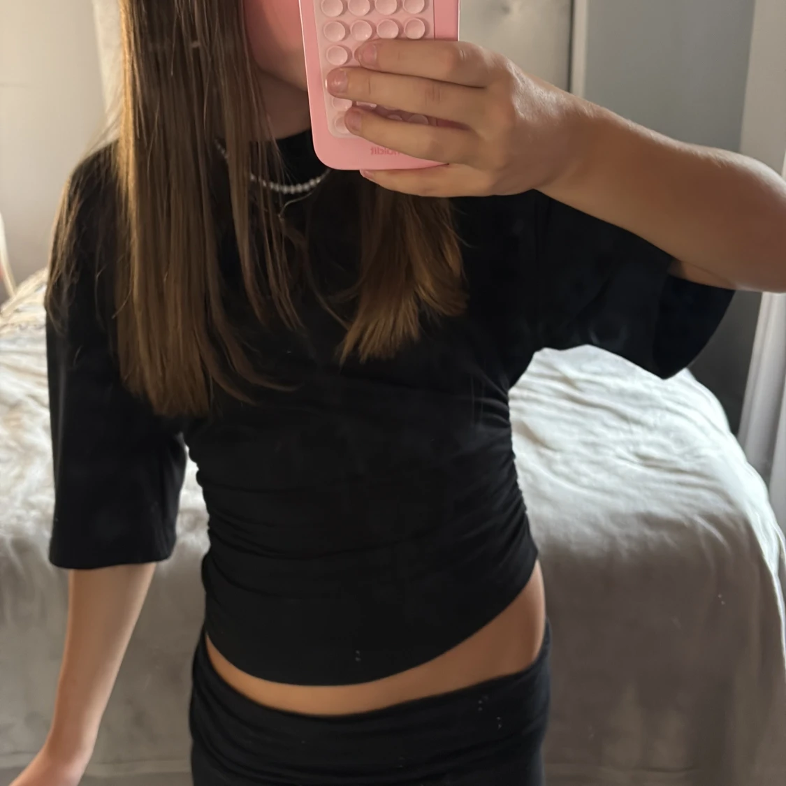 Svart t-shirt från Gina Tricot i mjuk bomull med korta ärmar och rund hals. Snygg snörningsdetalj på sidan ger en cool och modern look. Passformen är normal och tyget är slätt och bekvämt. Använd 1 gång, storlek S💞💞