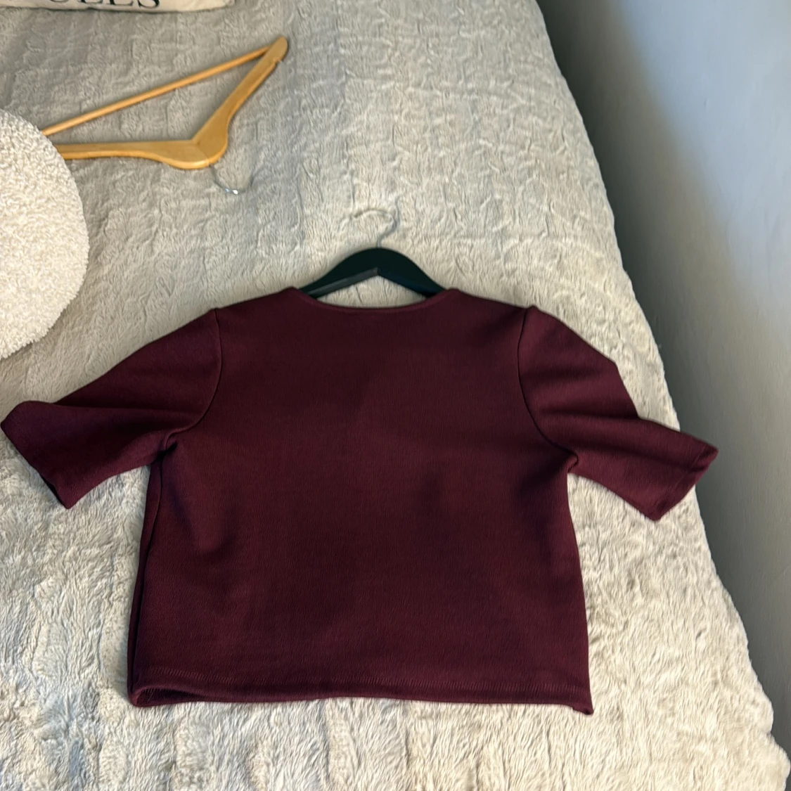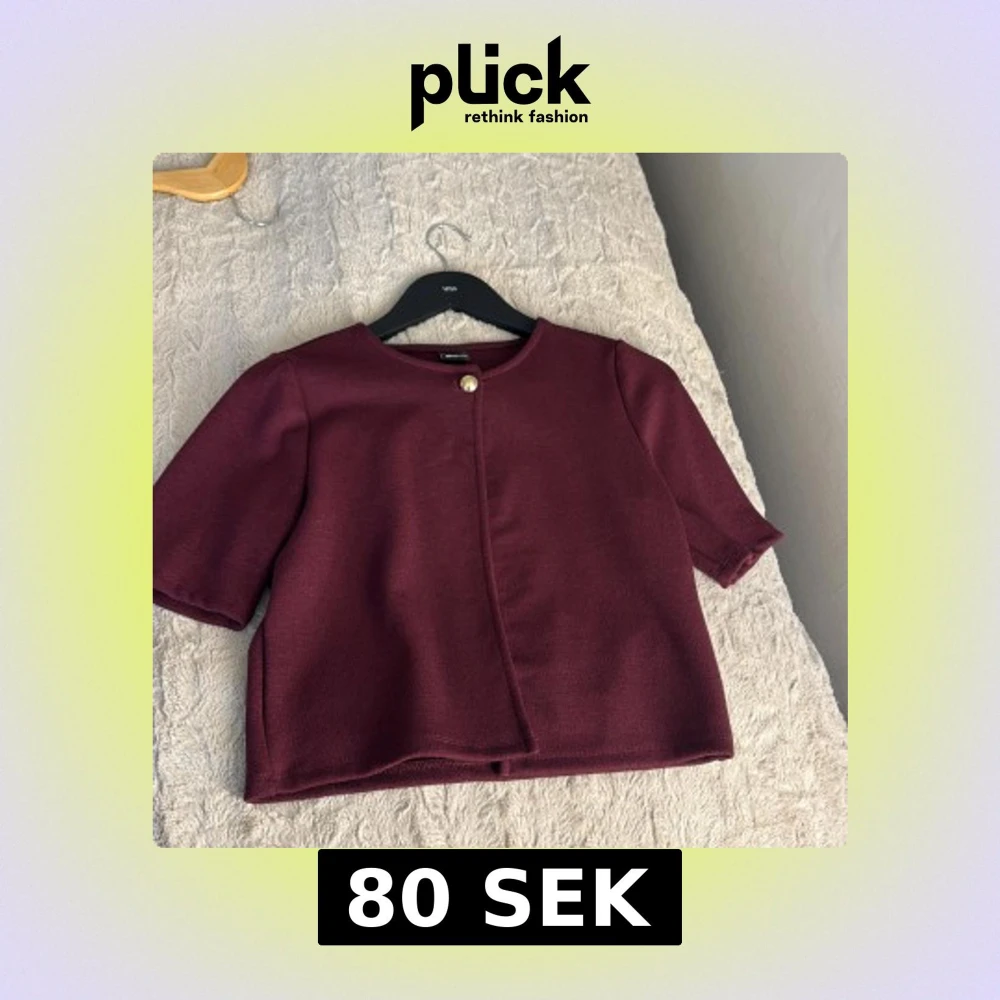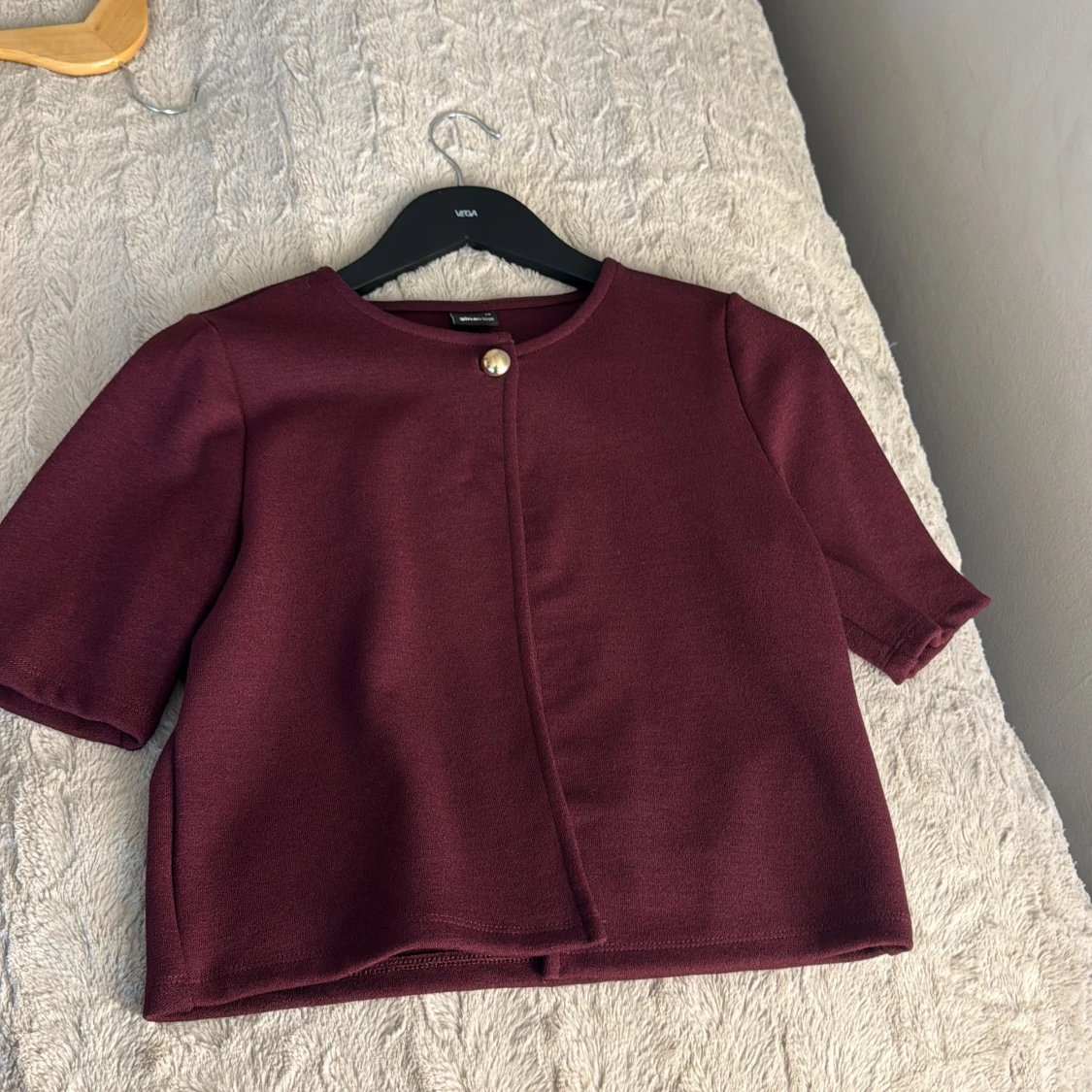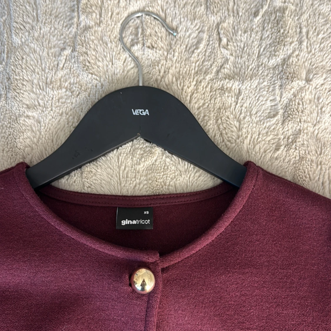 Kort, vinröd cardigan jacka från Gina Tricot med rund halsringning och en snygg guldfärgad knapp framtill. Jackan har korta ärmar och en clean, minimalistisk look som passar perfekt till lager-på-lager outfits.