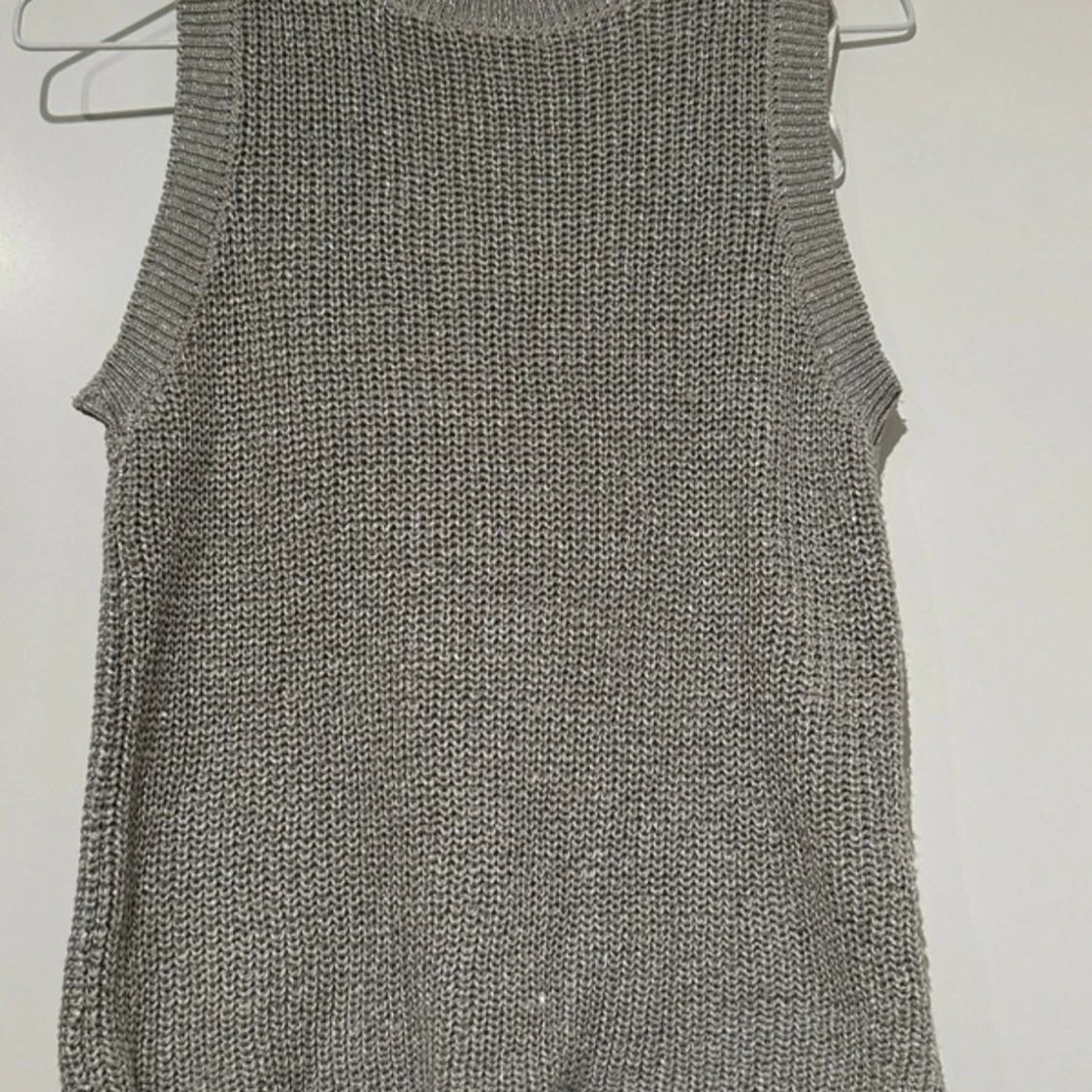 Säljer en snygg glittrig stickad väst/linne i silver.