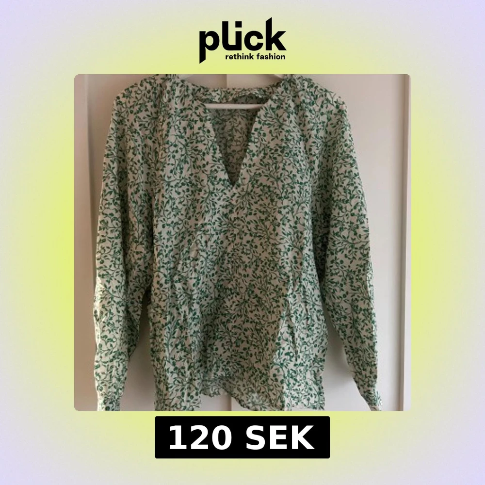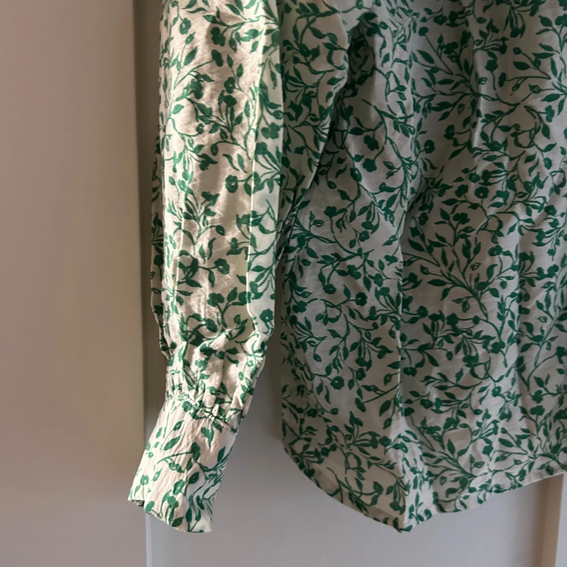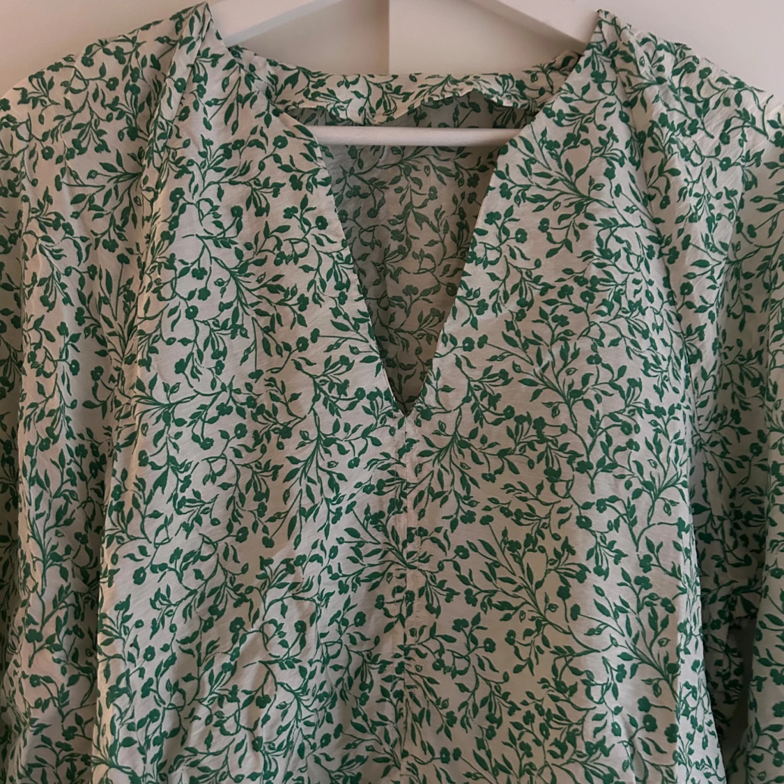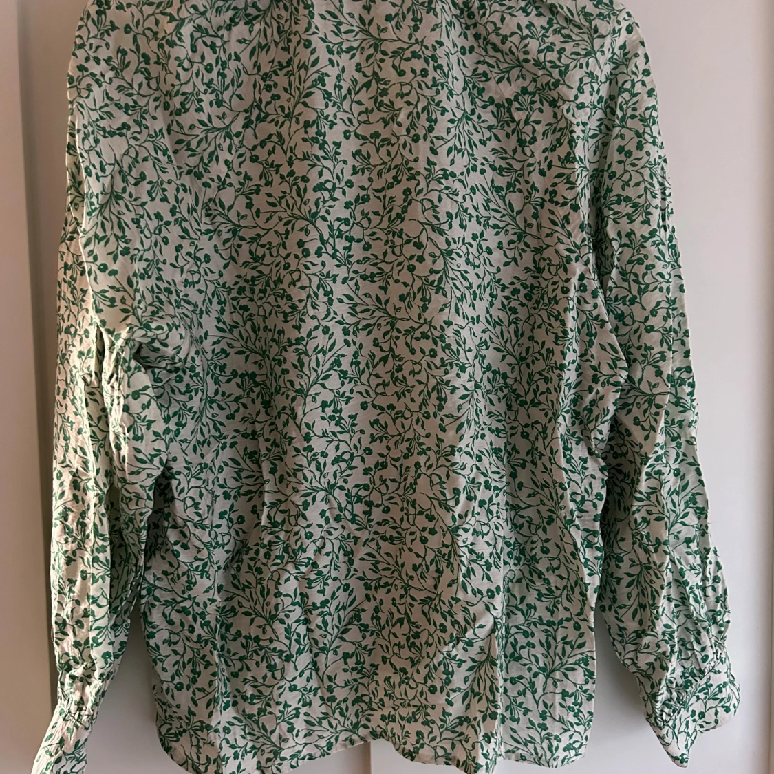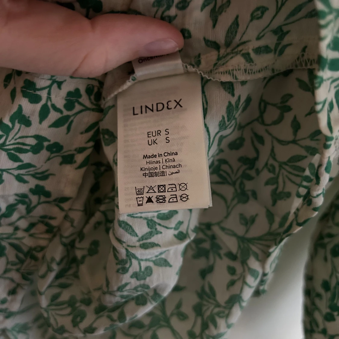 Snygg v-ringad skjorta från Lindex i storlek S. Skjortan är vit med grönt blommönster, har långa ärmar och är tillverkad i mjuk bomull. Perfekt för dig som gillar en avslappnad men ändå trendig stil.