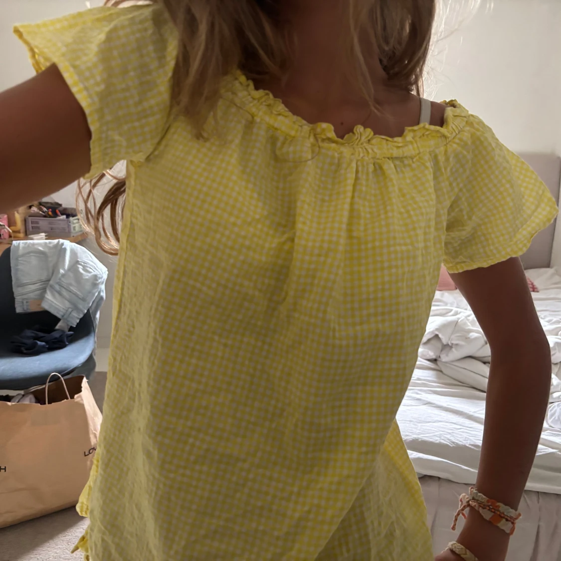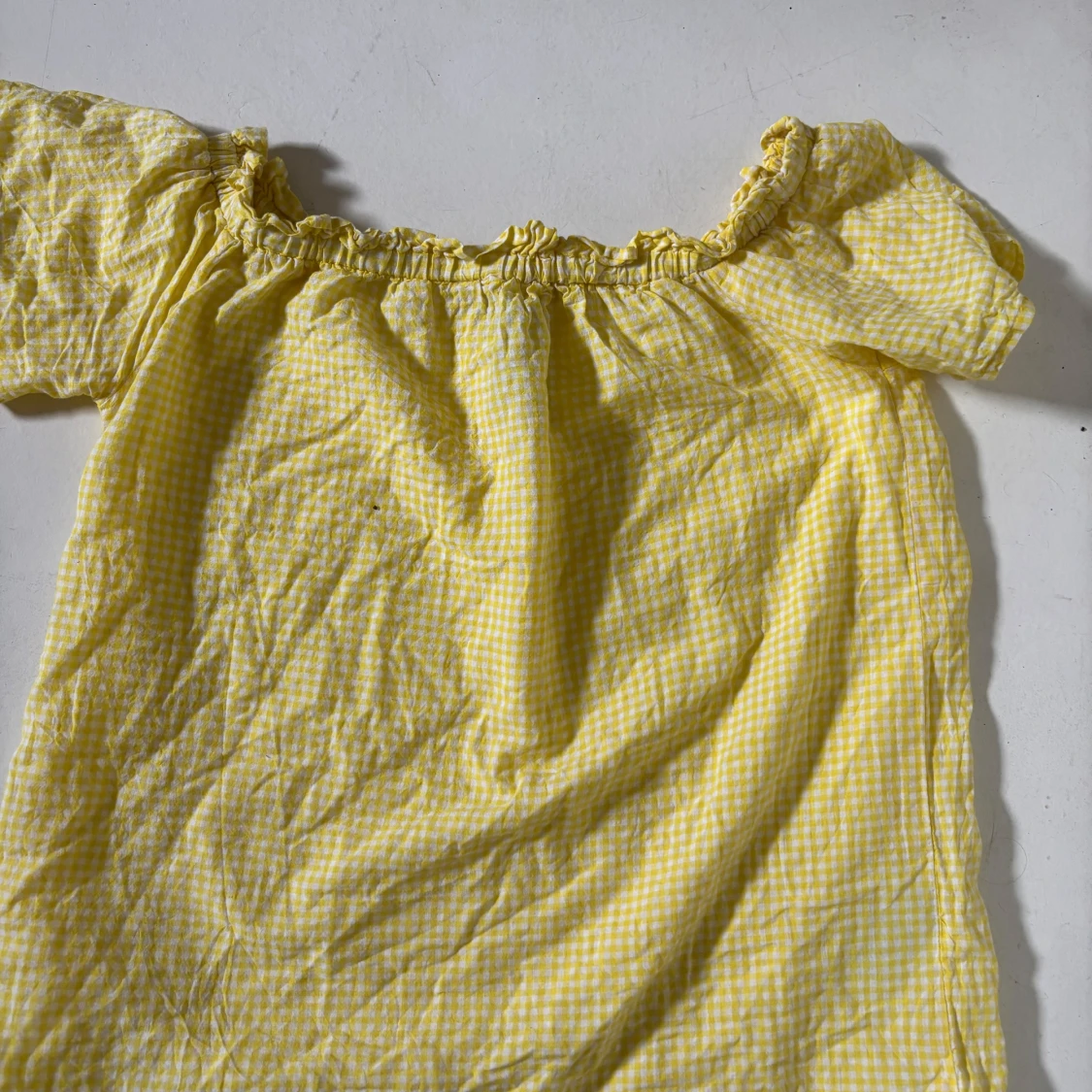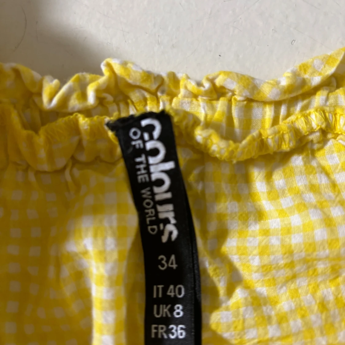 Supersöt gul och vit rutig blus från Colours of the World. Blusen har offshoulder-modell med volangdetalj vid halsringningen. Den är som en cool T-shirt!