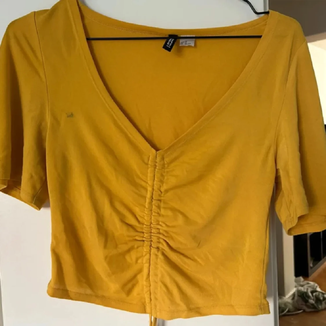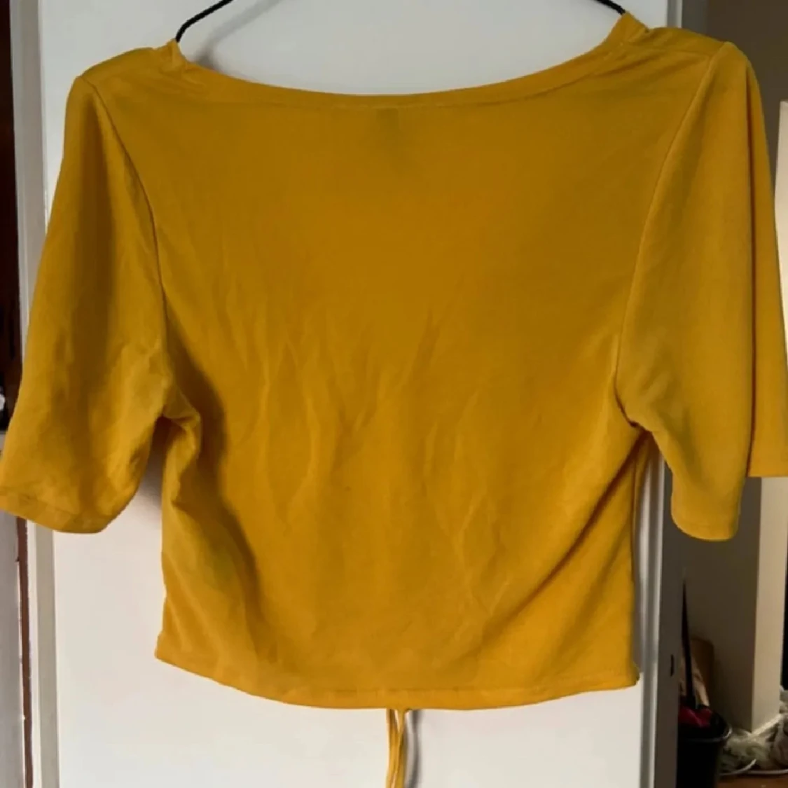 En jätte fin gul topp som man kan dra upp i mitten med hjälp av snöre, och volang i armarna! Tyvärr en fläck (som ses på bild) därav det låga priset!💕