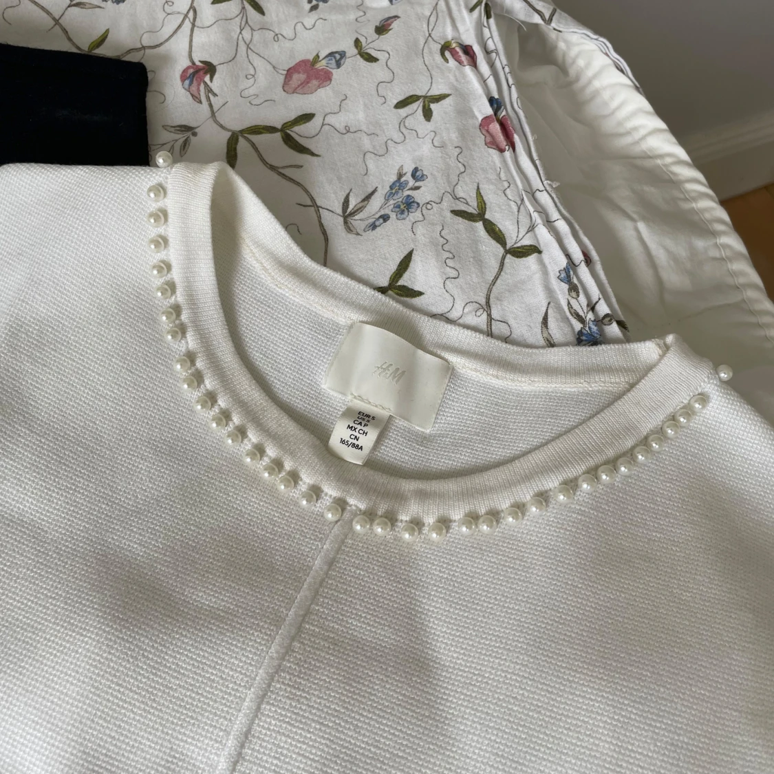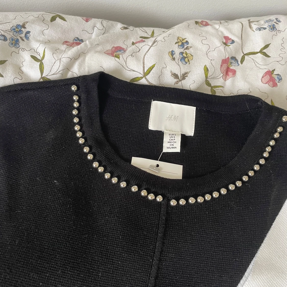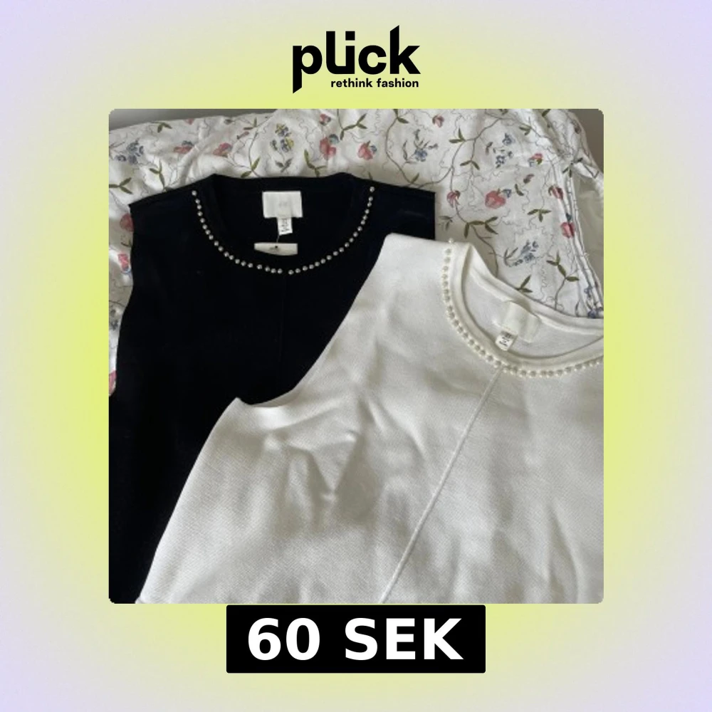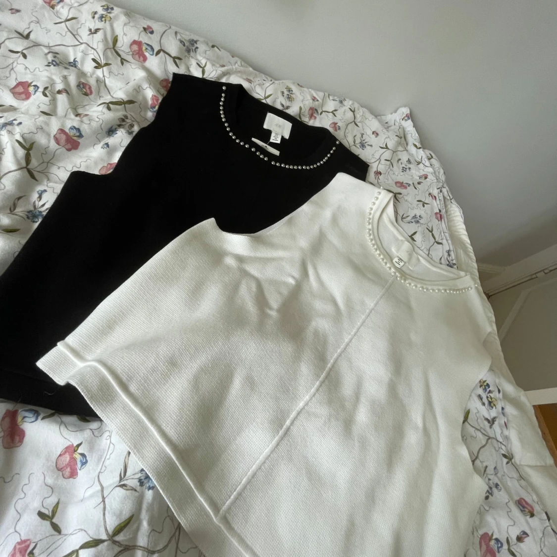 Två ärmlösa toppar från H&M, en svart och en vit, båda med rund halsringning dekorerad med pärlor. Köp en för 60 eller köp båda för 100❣️ kontakta för frågor😌
