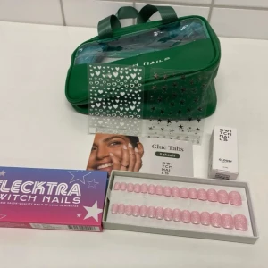 Komplett nagelkit med rosa glittriga lösnaglar från Svi Nails. Innehåller även limflikar och en praktisk grön förvaringsväska med stjärnmönster. Perfekt för att skapa en festlig look hemma.